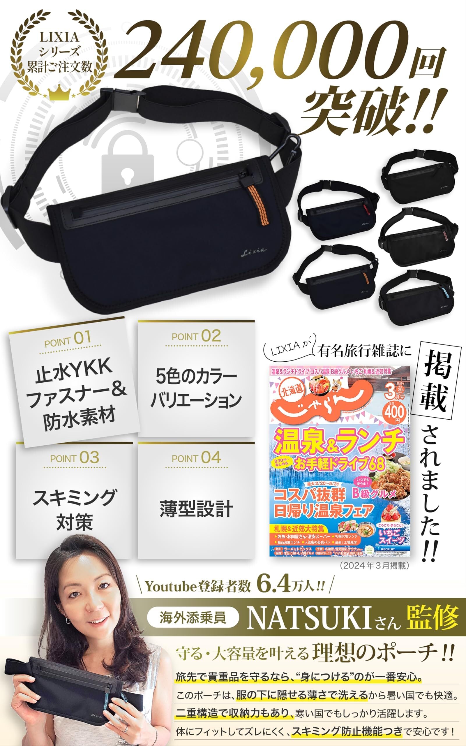 海外旅行や日常の外出で気になるのが「スリ」「盗難」「スキミング」などの被害。 実際に日本人観光客は狙われやすく、毎年7,800件以上の被害が報告されています。 そこで誕生したのが、Youtube登録者数6.4万人!世界126カ国以上を回った海外添乗員NATSUKIさん監修の【LIXIA セキュリティポーチ】。 YKK製止水ファスナー&防水素材を採用し、さらに国内検査機関で「防水性能」「RFIDスキミング防止機能」を実証済み。 薄型1.5mm設計ながら大容量で、パスポート・スマホ・現金・カードをしっかり収納。衣服の下に装着できるため、外から狙われにくく安心です。 軽量わずか140gで、普段使いにも◎。ライブ・ジム・リハビリ・旅行など、あらゆるシーンであなたの大切な貴重品を守ります。
