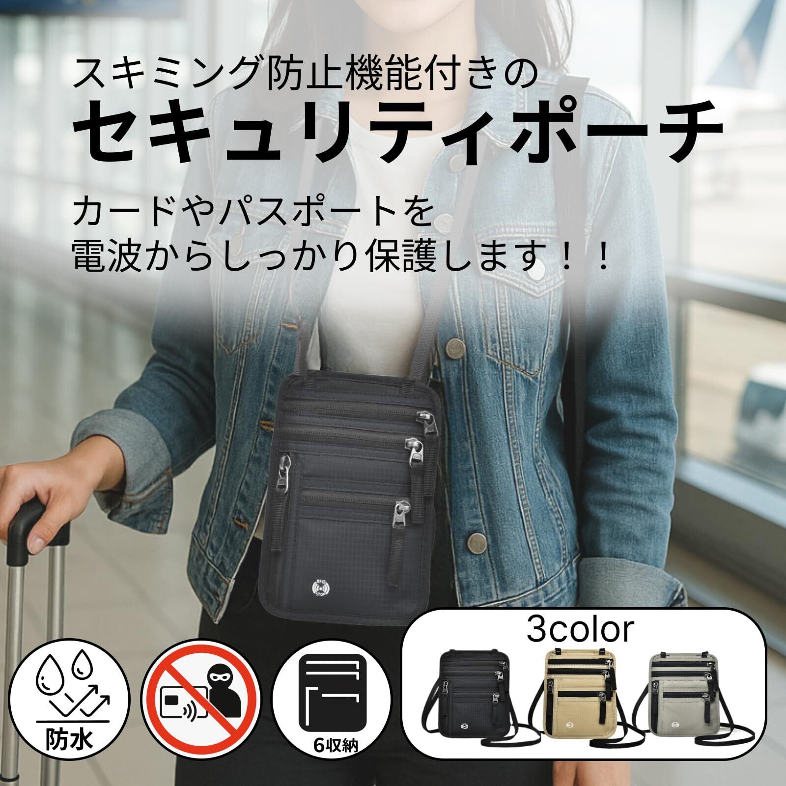 【RFIDスキミング防止機能で個人情報をガード】 RFIDスキミング防止素材を採用し、クレジットカードやパスポートなどのICチップ付きアイテムを外部の不正な読み取りからしっかり守る首下げパスポートケース。セキュリティポーチとして、海外旅行や空港での手続き時、混雑した観光地でも安心。旅先の不安を軽減し、快適な移動をサポートします。