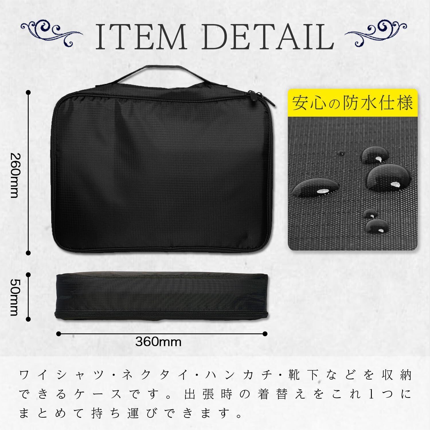 【出張時に便利な衣類の整理収納ケース】ワイシャツやネクタイ、肌着、靴下などの小物をたっぷりと収納/整理整頓できるので、必要なアイテムの一括管理が可能です。また、安心の防水仕様で、ビジネスマンのための収納ケースとして、高い評価をいただいています。万一、お土産の購入など荷物が増えたとしても、取っ手が付いているので、収納ケースだけでの持ち運びもでき安心。最大で約3日分の収納ができ、持ち運びもスマートな軽量小型のワイシャツケースとしておすすめです。