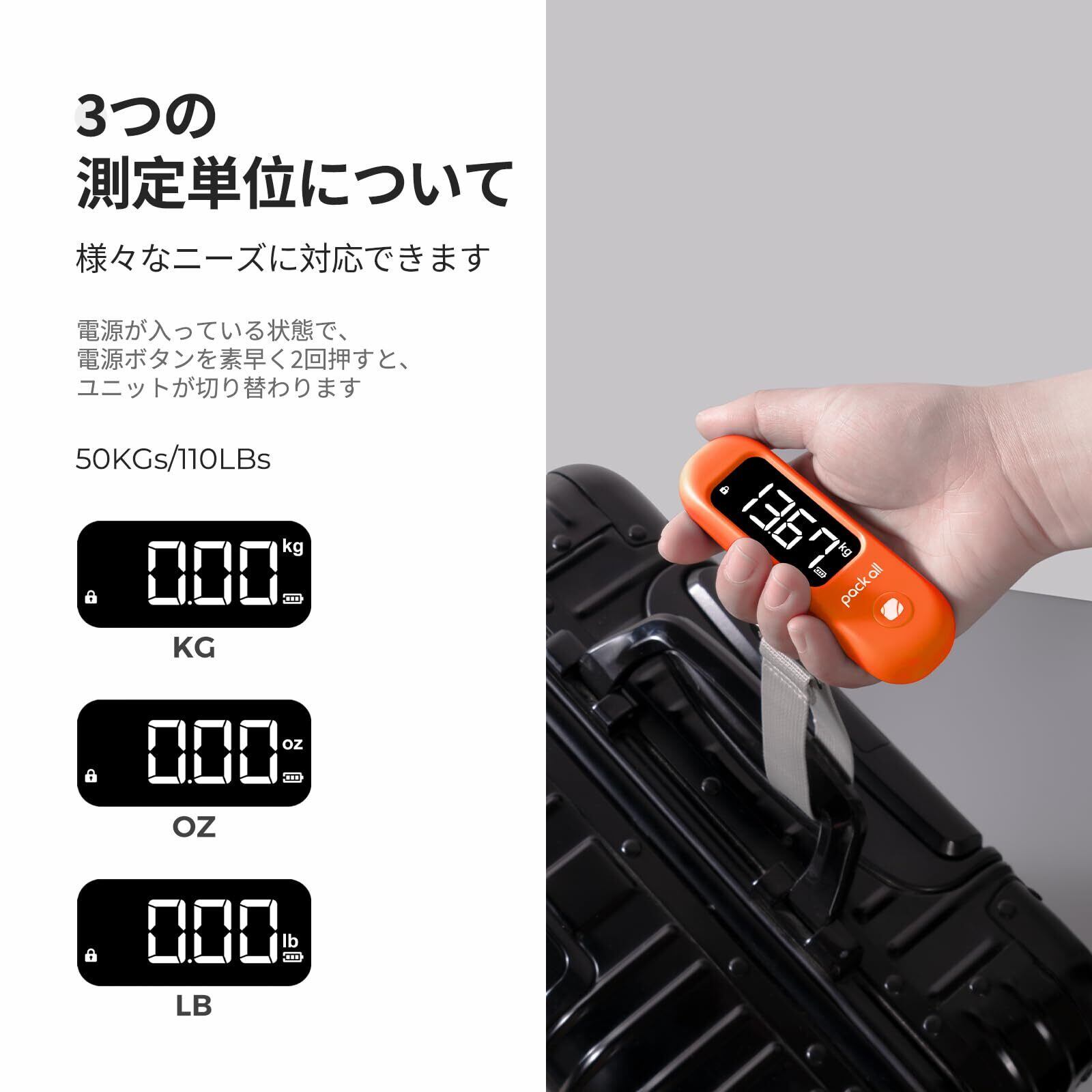 【在庫セール】pack all 荷物 旅行はかり 最大50kgまで量れる LCC用 携帯式デジタルスケール 吊り下げ式 LCDスクリーン バックライト付き 風袋引き機能付 バッテリー付き 便利 軽量(オレンジ)