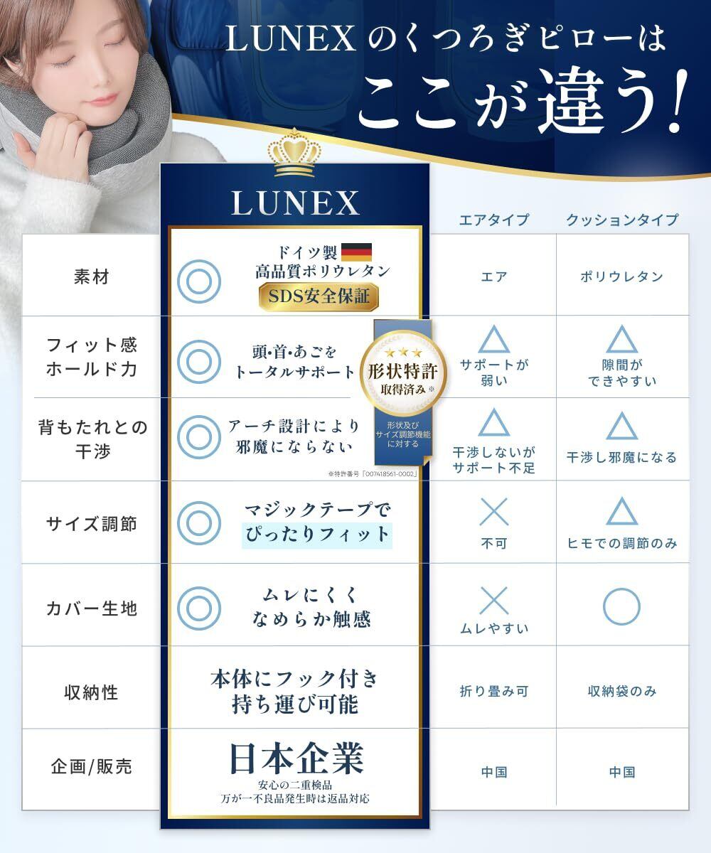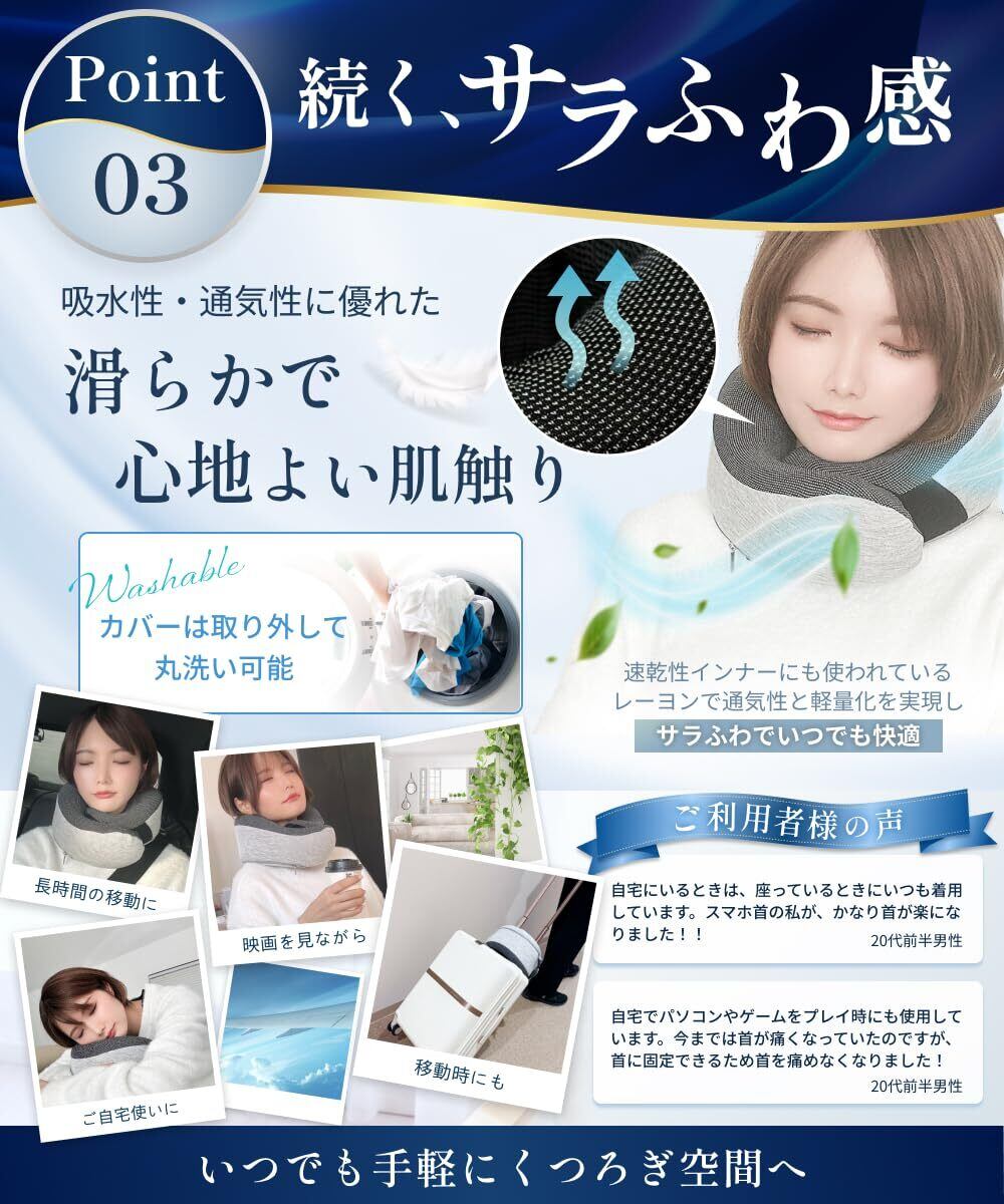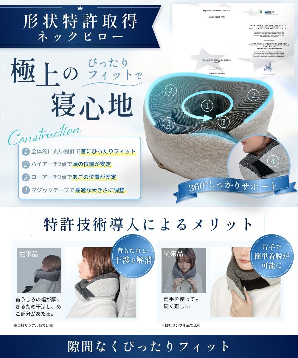 【形状&デザイン】首と頭を優しく支えるフィットカーブ設計により、首回りにぴったりフィットし長距離移動でも快適な旅行を実現します。