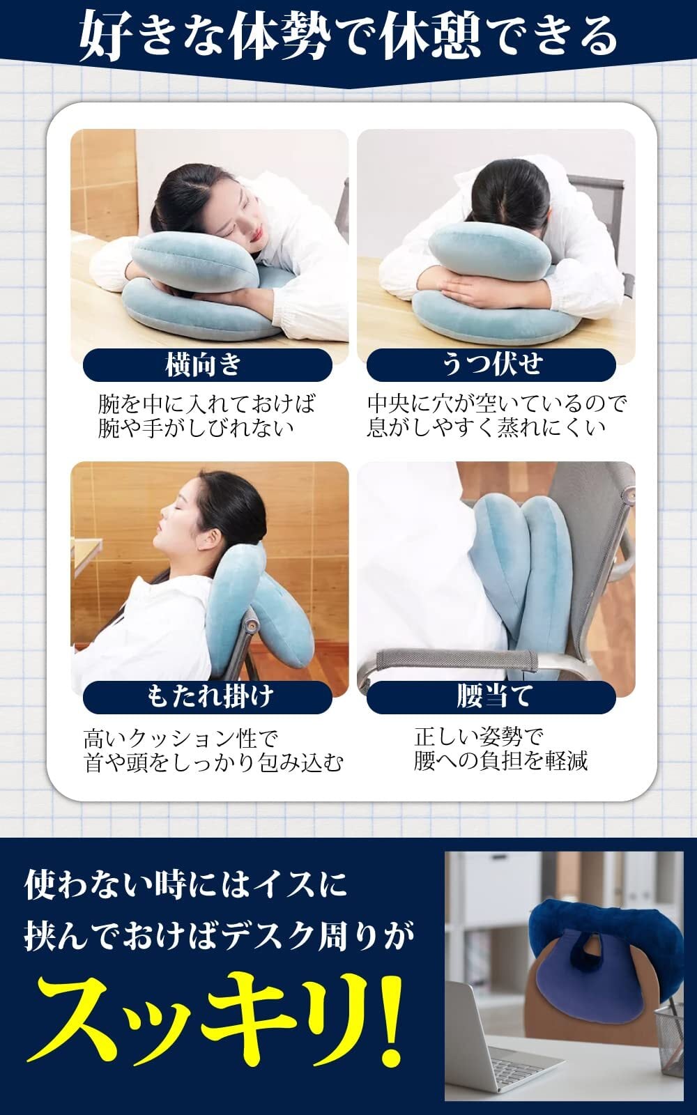【在庫セール】hichago 昼寝枕 うつ伏せ寝枕 昼寝クッション お昼寝枕 【デスクで仮眠】 受験勉強 デスクワーク うつ伏せ クッション 枕 パワーナップ ネックピロー 昼寝 うつぶせ寝 うつぶせ オフィス 洗える 洗濯機 (シルバーグレー)
