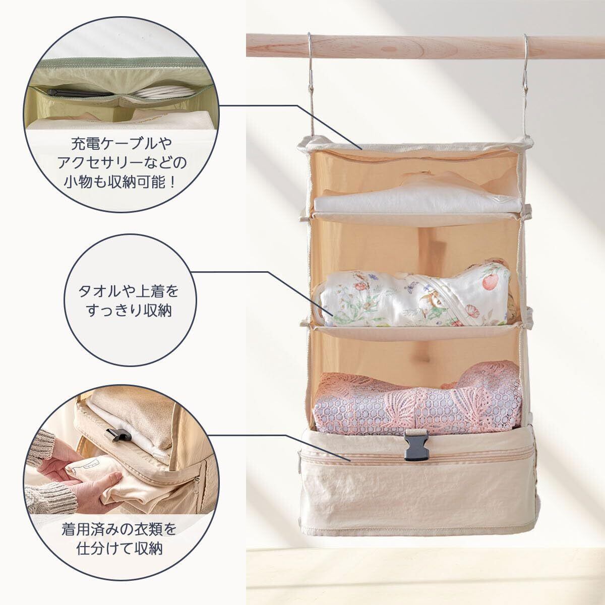 【幅広い適用】旅行用便利アイテムとして位置づけていますが、住居用の収納便利アイテムとしてもかなり優秀です。取り付けも出し入れも簡単で、見た目もシンプルなので、家のクローゼットだけではなく、旅行先のホテル、学生寮、車内やジムなどの場合も有効活用できます。