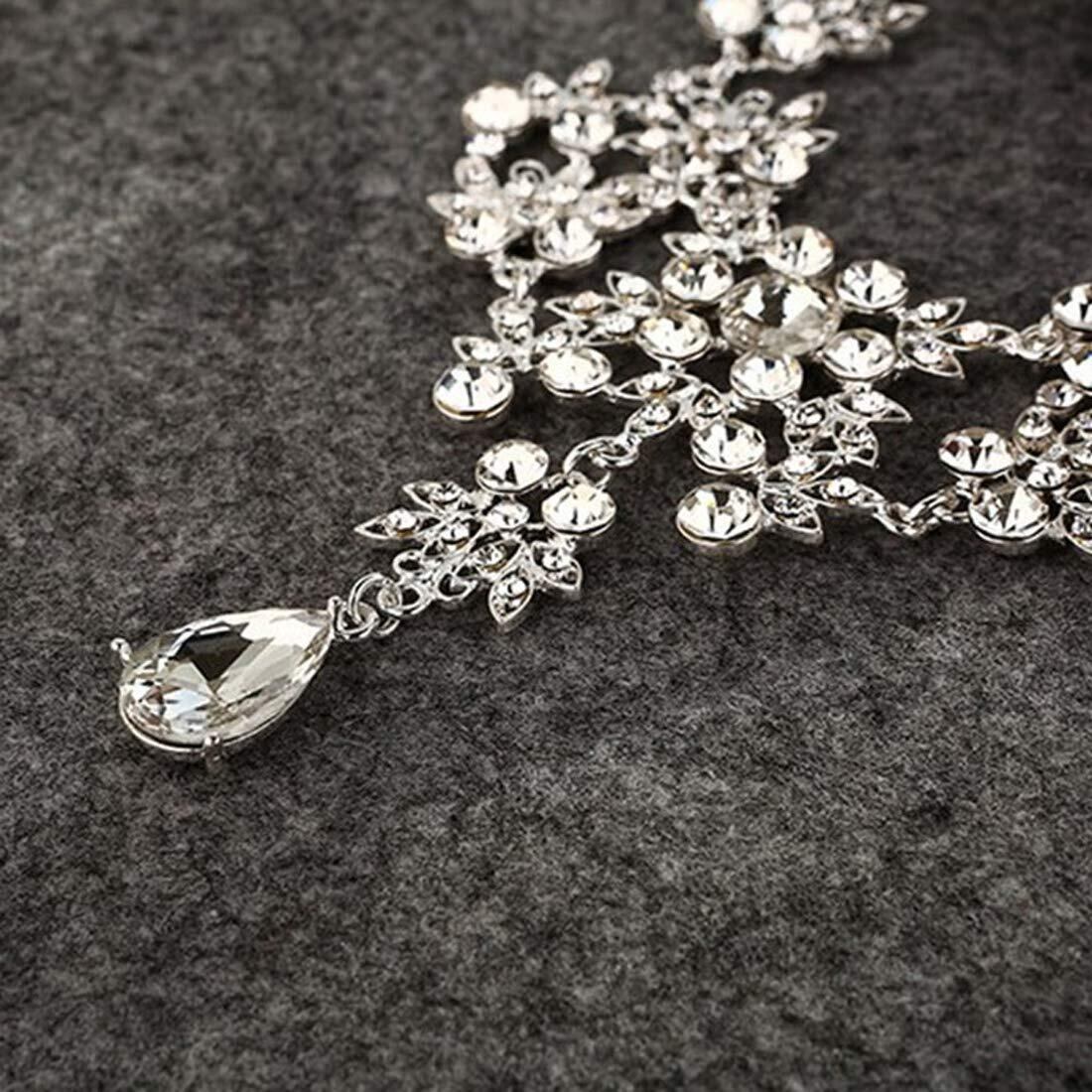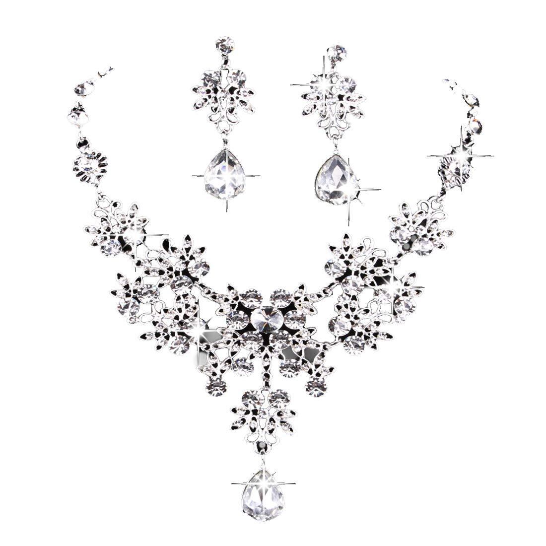 大粒クリスタルガラスとラインストーンをふんだんにあしらったゴージャスなファッションジュエリーです。ネックレスとピアスの2点セットにてお届けいたします。眩いばかりに煌く上品な雰囲気はあらゆるパーティ・フォーマルシーンであなたの装いをより一層演出し輝かせます。 水晶のような多彩な輝きを放つストーンときらめくラインストーンでお顔周りを華やかにかつエレガントに演出します。 パーティー、結婚式、ウェディング、二次会、その他のフォーマルなシーンにも、社交ダンス、ダンス用のアクセサリーとしても、また挙式後のお食事会、女子会、発表会などにもお使いいただけます。
