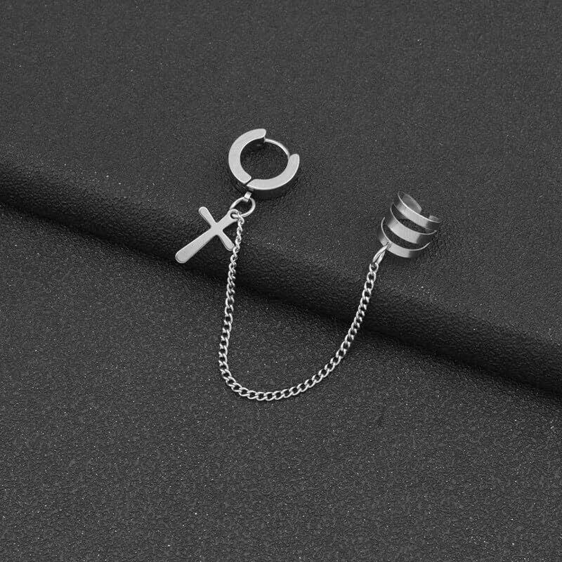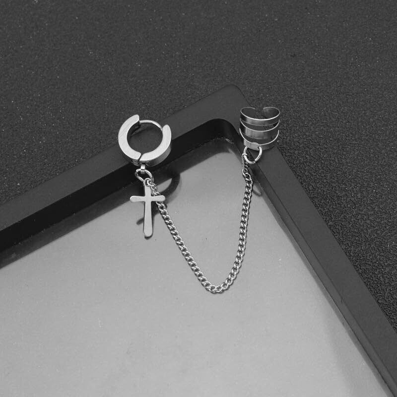 耳元で揺れるクロスモチーフと繊細なチェーンが印象的な、片耳用アクセサリーです。ピアスタイプとイヤーカフタイプの2種類をご用意しており、ピアスホールの有無に関わらず着用可能。シンプルながらも存在感のあるデザインは、メンズ・レディースどちらにも使え、カジュアルからストリートスタイルまで幅広く活躍します。 金属アレルギーに配慮したステンレス素材を採用し、肌にやさしく日常使いにもおすすめです。クロスとチェーンの組み合わせは高見えするのに軽量で快適な着け心地。ちょっとしたギフトやペアアクセサリーとしてもぴったりのアイテムです。