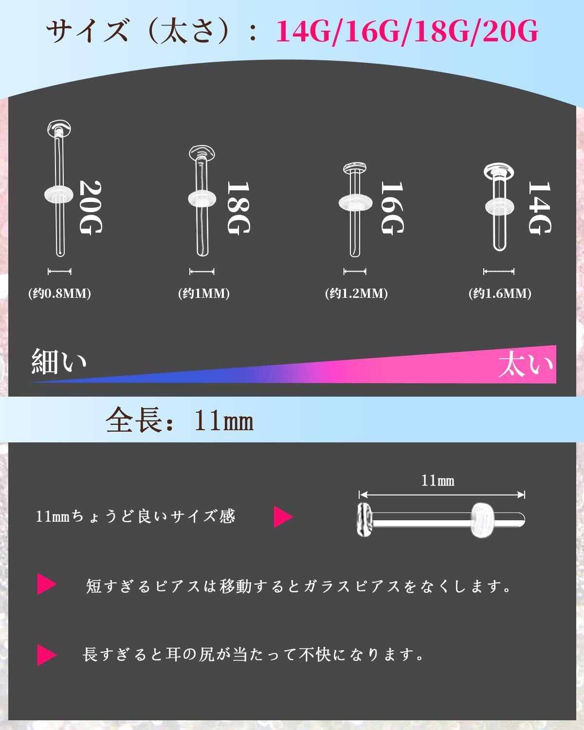 "ゲージ・内径が選べる:ゲージは20G(0.8mm)・18G(1mm)・16G(1.2mm)から選べます。耳たぶのファーストピアスにおすすめの16G。軟骨ピアスのファーストピアスにおすすめの14G ファッションピアスにおすすめの18G。2個/4個セットが選べる。2個セット:透明ガラスピアス2本、O型固定リング4個、梅ピアス2個、ハンバーグピアス2個。4個セット:透明ガラスピアス4本、Oリング8個、梅栓4個、ハンバーグ栓4個です。"