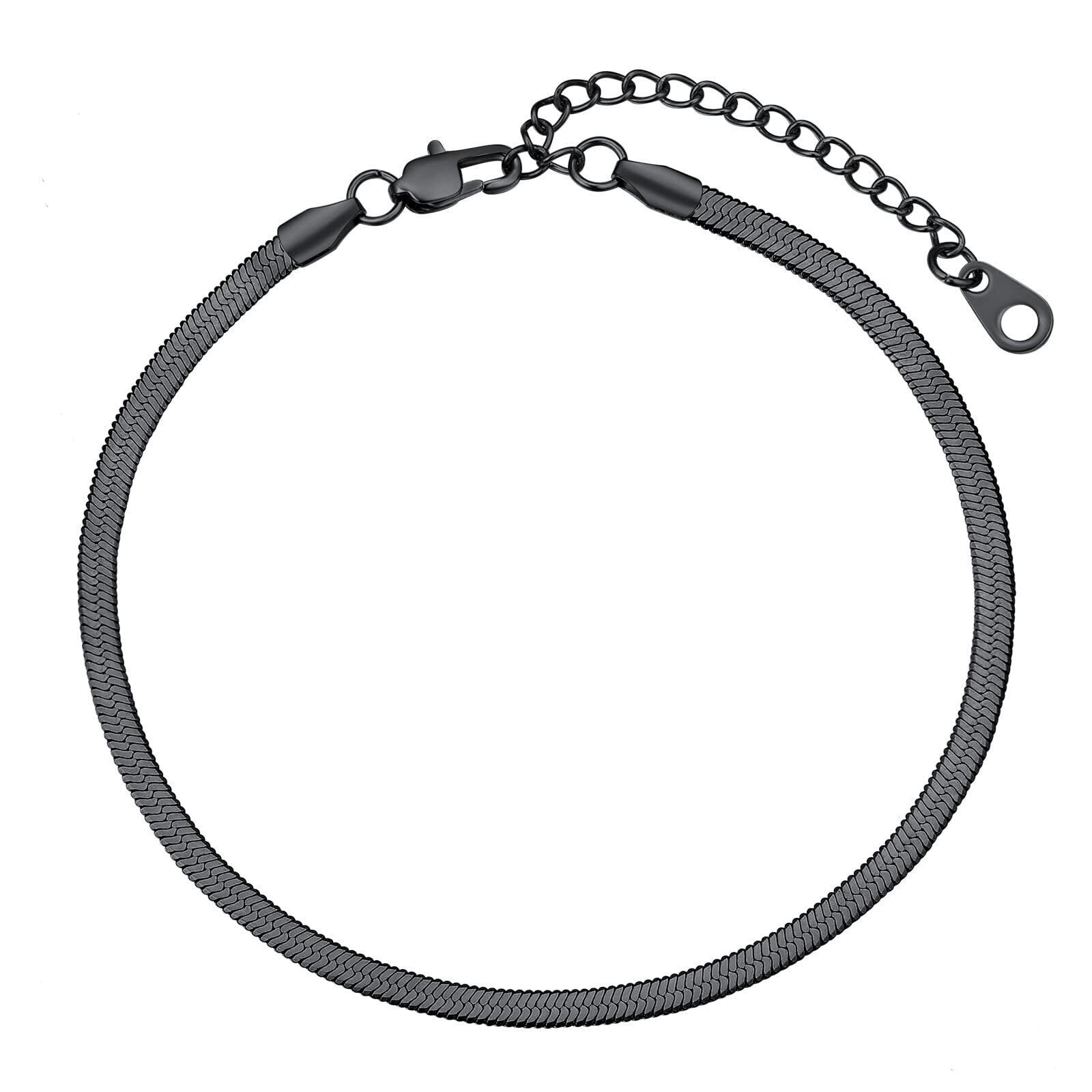 スネークチェーンアンクレット・ブレスレット:印象的な足首や手元に仕上げる、シンプルなスネークチェーンアンクレット・ブレスレットが登場。洗練された雰囲気の中に漂う大人っぽさ、主張しすぎなく、コーディネートに取り入れやすいです。こちらはシルバー、ゴールド、ブラックとピンクゴールドの人気4色、幅3mmと幅5mmのバリエーションからお選び頂けます。