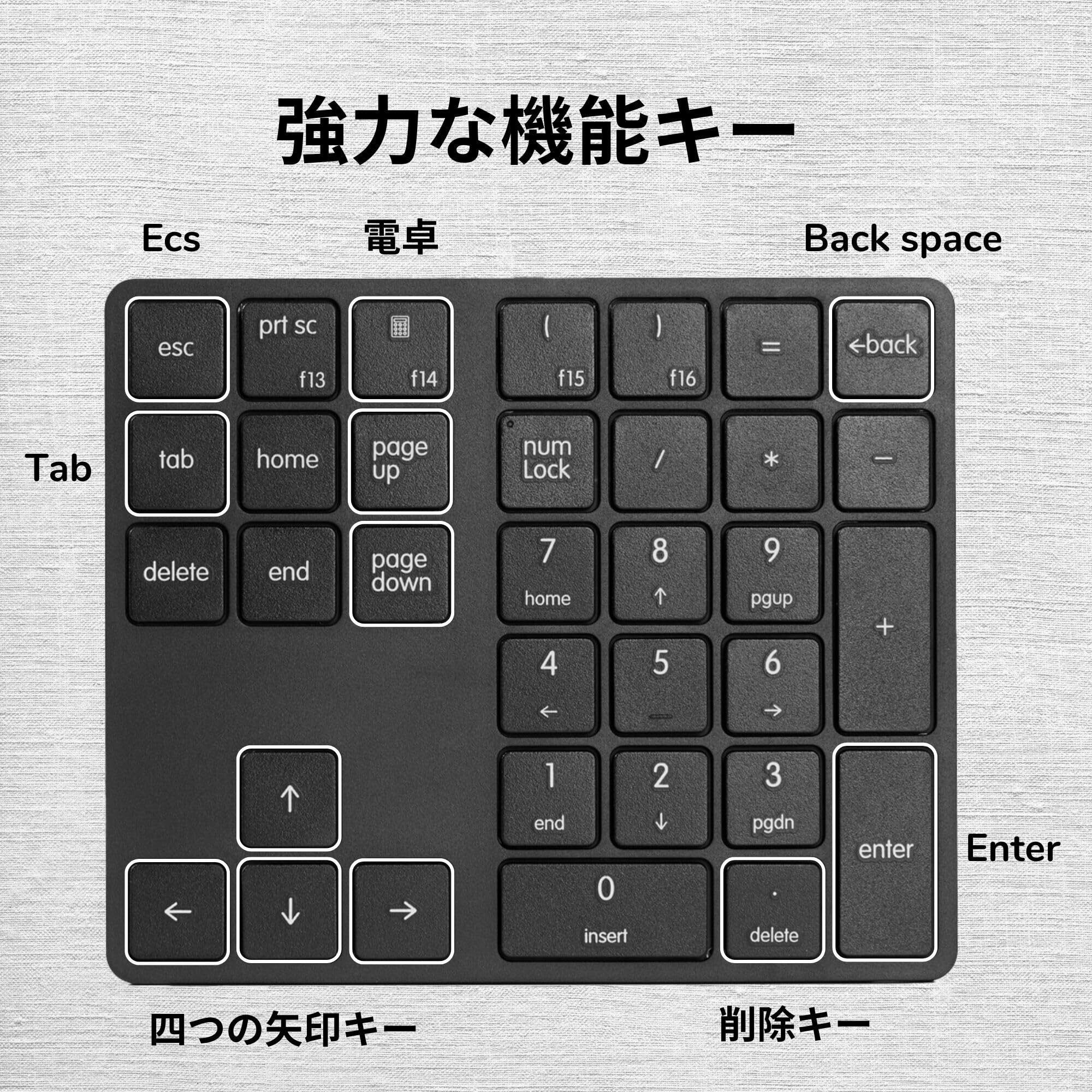 ⏎【34キーのテンキー】:このテンキーは大量の打字タスク向けに設計されています。これらの34のキーには、一般的に使用されるデジタル処理機能が含まれており、メインキーボードとコンピューターのテンキーの間で手の移動が必要ありません。このキーボードには、Esc、Tab、Back Space、Delete、Home、End、Prt sc、および四方向の矢印キーなどの重要なキーも組み込まれています。また、いつでもキーボードの計算機能を便利に起動できるように、電卓のショートカットキーも含まれています。