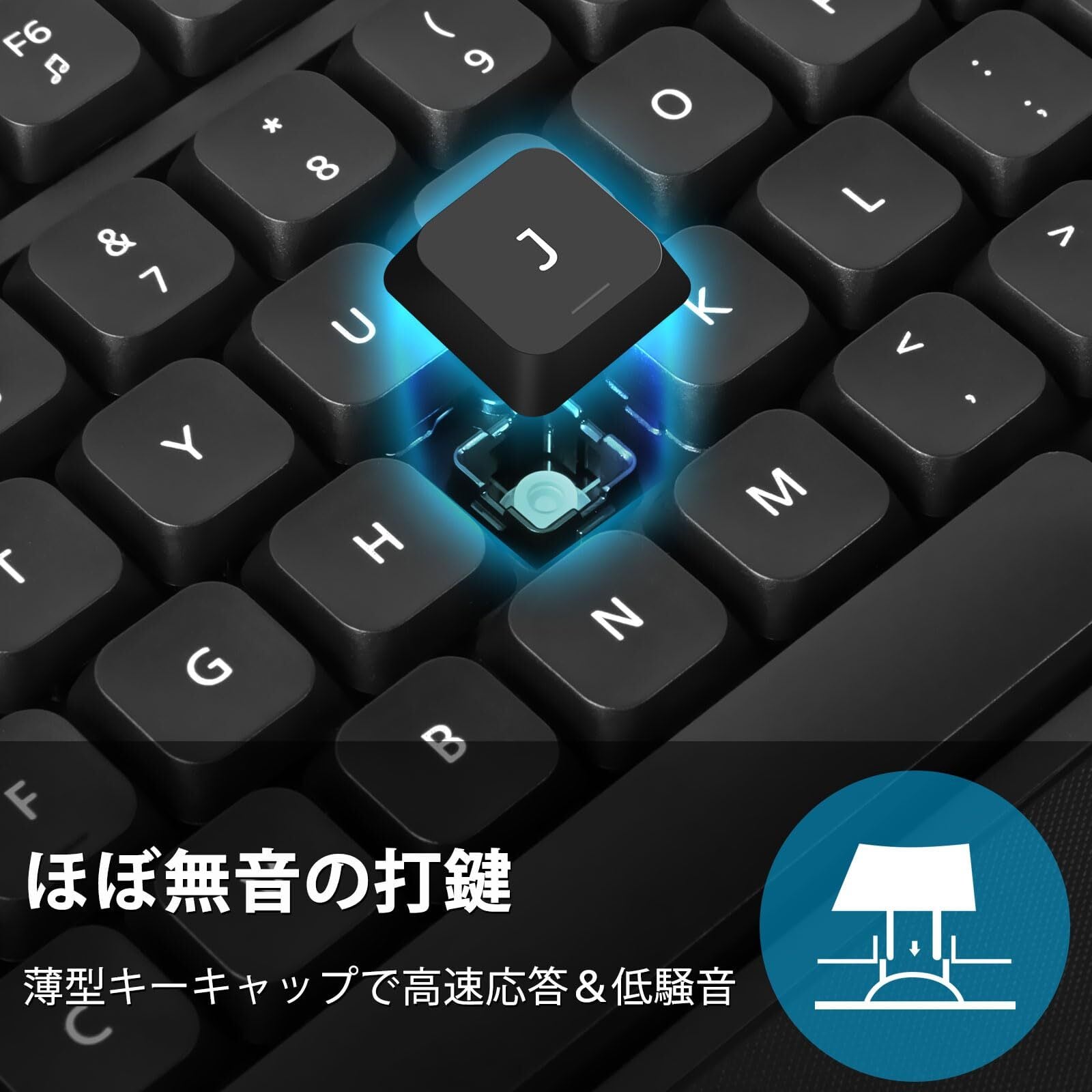【図書館でもOK!超静音設計】キーボードの打鍵音とマウスクリック音を最大90% 低減しています。周囲への配慮が必要な図書館、共有オフィス、さらに自宅の深夜作業に最適です。静音スイッチを採用したマウスは、ゲームや動画編集時の不必要なストレスも解消します。