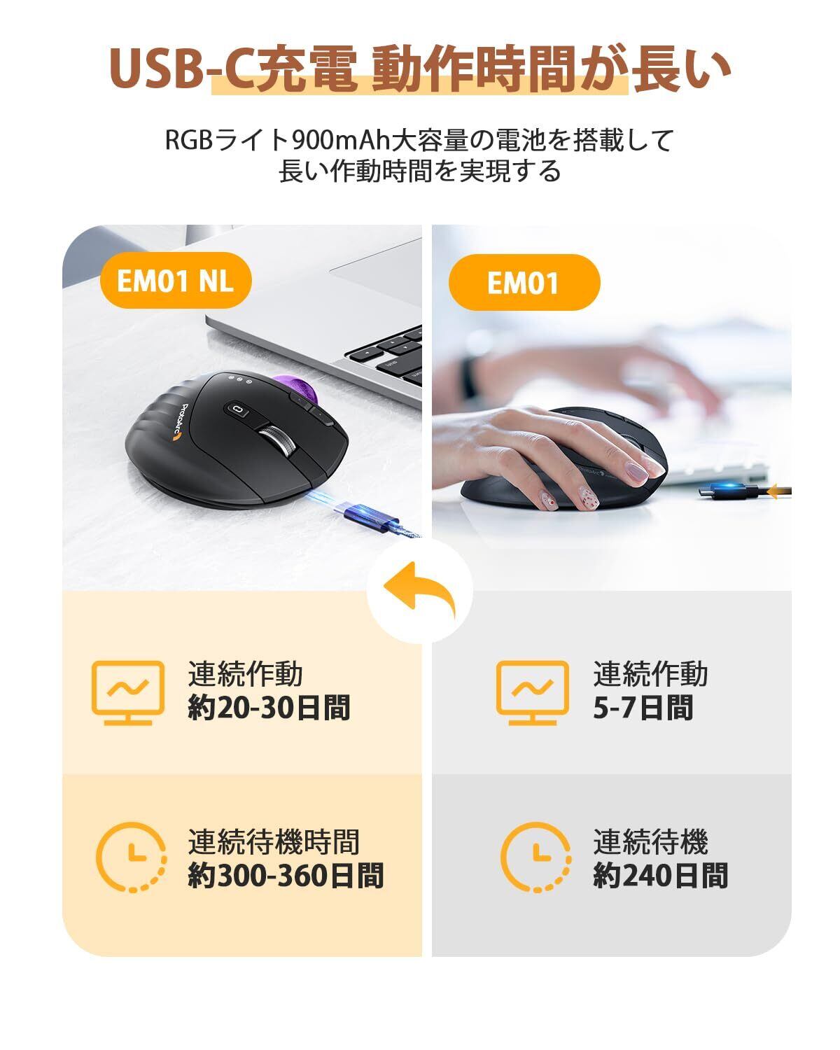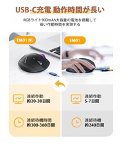充電式エコ的 電池不要の充電式なため、エコで環境にやさしい充電式トラックボールマウスです。市販の電池式や、低電量の物より、耐久性のある900Mah大容量の電池を搭載しており、付属の充電ケーブルで、フル充電したら、連続待機時間は約300-360日間、約160-240時間(約20-30日間)使用可能です。ProtoArc EM01の5-7日の作業時間よりも倍長くなります。充電回数も少なく、無線で一番ストレスとなる乾電池の交換という作業は不要です。【注意❶.1日8時間PCを使用中に、マウス操作を25%程度行うこととして、計算した使用時間です。➋.充電用のusb-cコネクタ部分が少々狭くて、必ず付属されたケーブルで充電してください。】