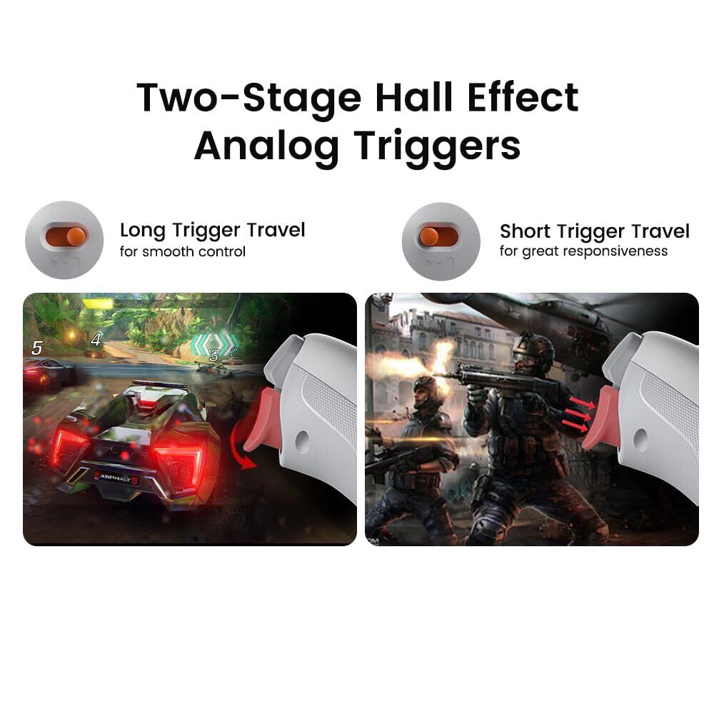 GameSirホール効果スティック/トリガー搭載:非接触型磁気センサーによりスティックドリフトを防止。高耐久・高精度の操作を実現し、摩耗にも強い構造です、しかも、滑らかな押し心地のホール効果トリガーに加え、トリガーストップ機能で即時反応をサポート。M+LT/RTでハイレスポンスモードも切替可能