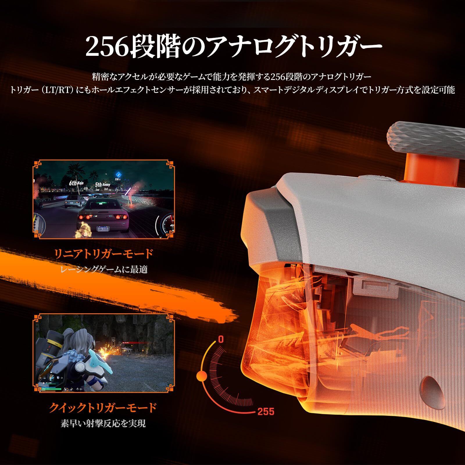 「ホールスティックとホールトリガーで新次元の操作感」aether コントローラーには、ホールスティックとホールトリガーが搭載されており、従来の機械式センサーを超える高い反応性と耐久性を実現します。ホールスティックは、スムーズで正確な入力を可能にし、すべての操作が直感的に反映されます。また、ホールトリガーは、極めて細やかな操作に対しても瞬時に反応し、プレイヤーの意図を忠実に再現します。トリガーモードは、「リニアトリガーモード」と「クイックトリガーモード」に簡単に切り替えることができ、プレイヤーのプレイスタイルに合わせて最適化可能です。これにより、FPSやアクションゲームでも、迅速かつ精緻な操作が可能となり、ゲームの没入感が一層高まります。