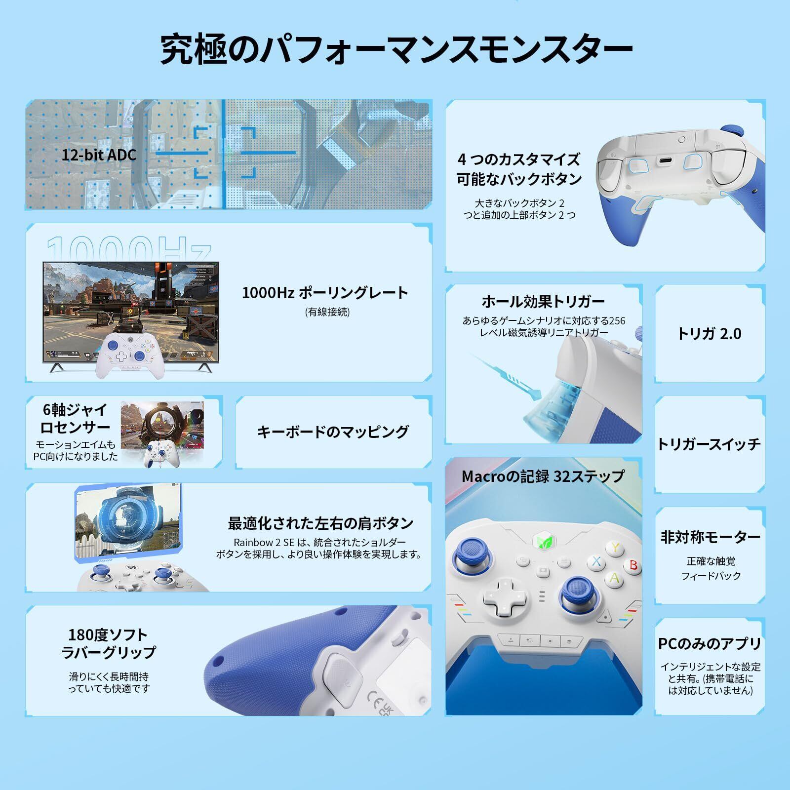 【マルチプラットフォームゲーミングコントローラー】ワイヤレスPCコントローラーRainbow 2 SEは、Switch、Windows10&11、Android7.0+、iOS14.0+で動作します。 PC コントローラーは、2 つのカスタム バック ボタン、2 つのトップ ボタン、モーション エイミング、ターボ、マルコ、デュアル モーター、ホール効果トリガー、3 セットのジョイスティック、4 方向および 8 方向方向パッド、1000 Hz の有線ポーリング レート、 2000 レベルの軸解像度、内蔵 Bluetooth、キーボード マッピング、PC 上のアプリ (携帯電話ではサポートされていません)。 【音声は非対応です】