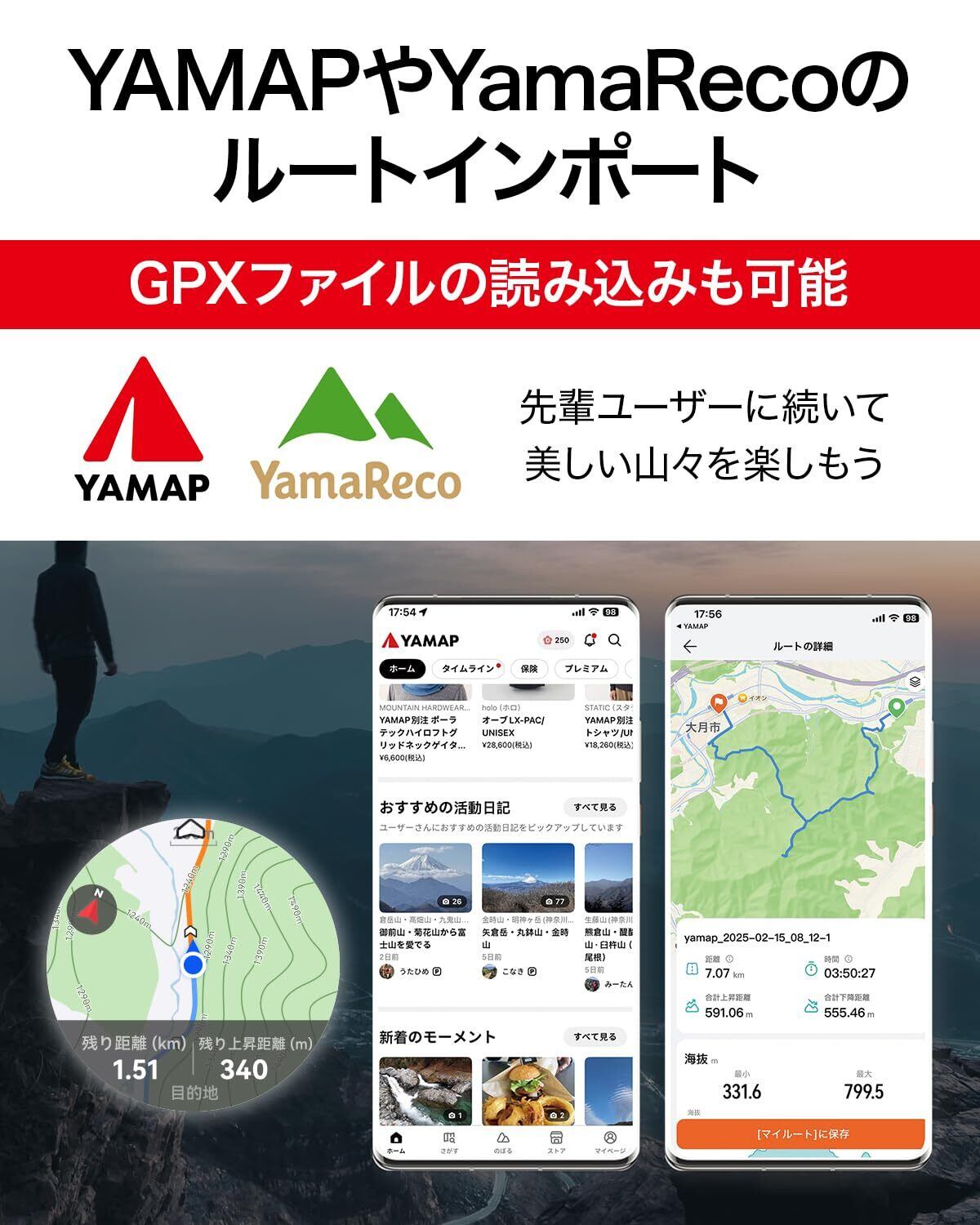 【手首に付ける登山ガイド】YamapやYamaRacoのルートインポートに対応。GPX(GPS Exchange Format)ファイルの読み込みも可能。GPSデータのやり取りが可能になり、等高線マップのフルカラー表示や、登山中の豊富なデータ表示で、登山体験をより便利に、より快適にサポート。