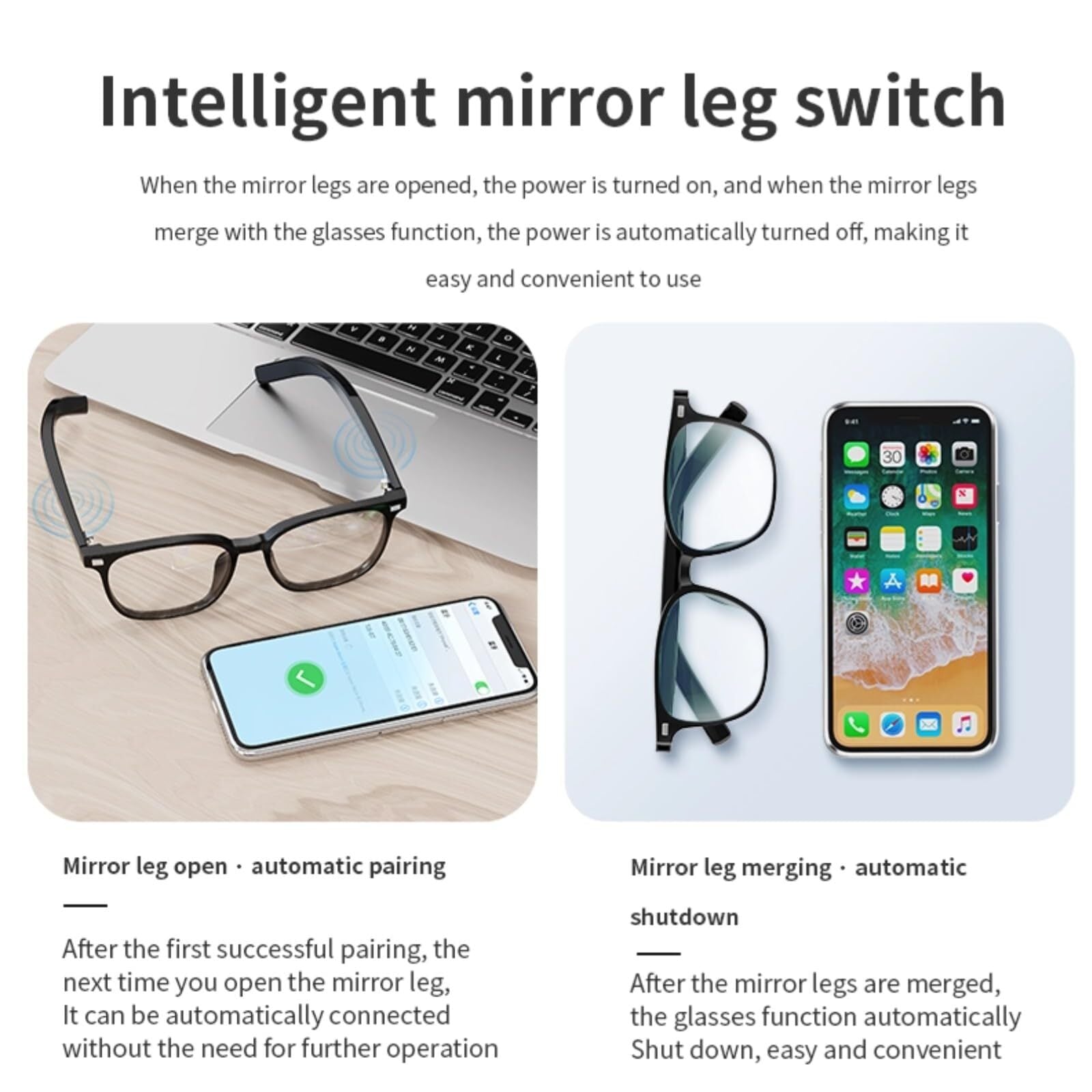 【Smart Temple Switch】:AI翻訳は、寺院を開いたときに自動的にメガネに電力を供給し、閉じたときに停止し、毎日の摩耗に合わせて簡単で便利に使用できます。