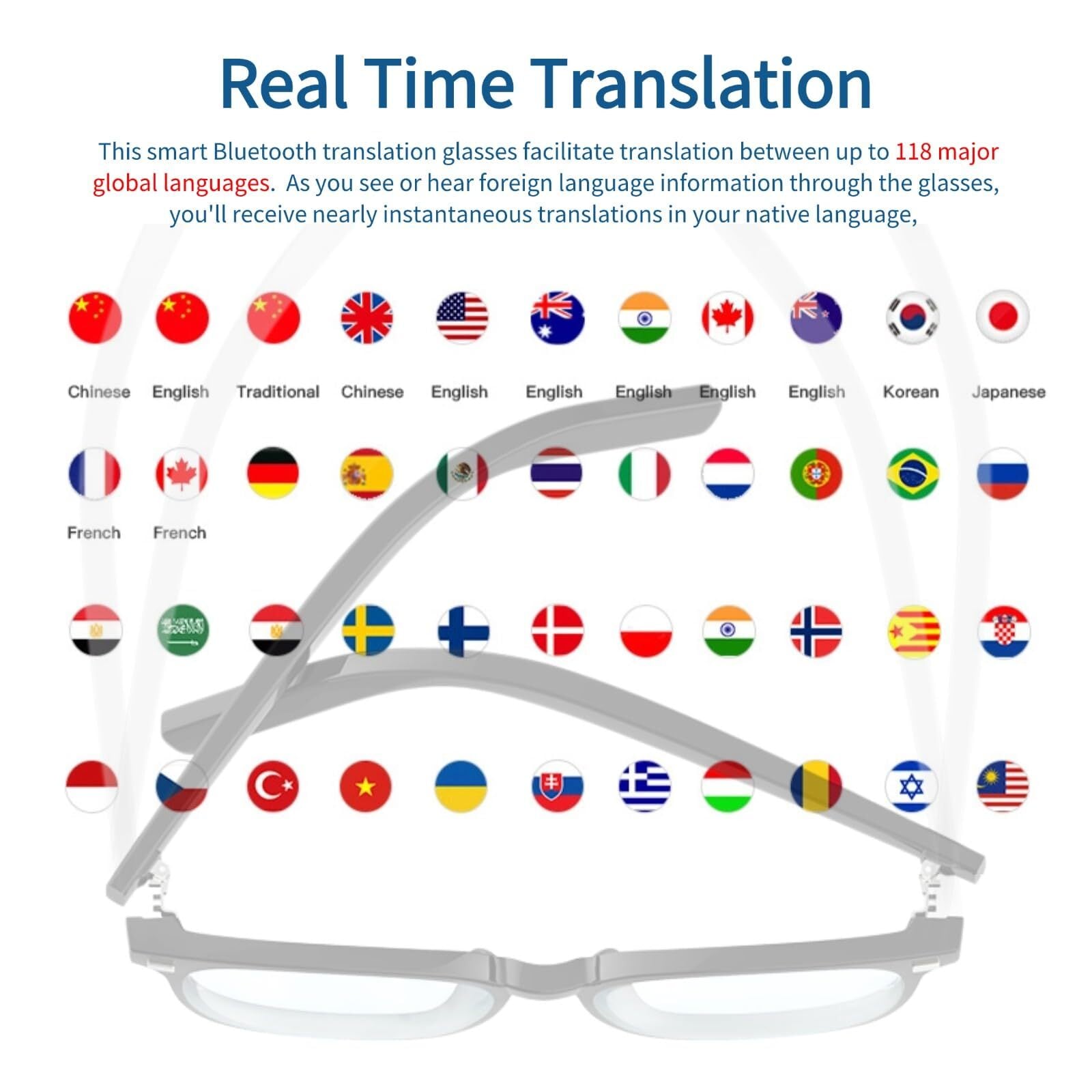 【マルチ言語サポート】:このスマートなBluetooth翻訳メガネは、最大118の主要なグローバル言語間の翻訳を促進します。それはあなたの側に個々の言語の専門家を置いて、言語間のシームレスなコミュニケーションを確保するようなものです。