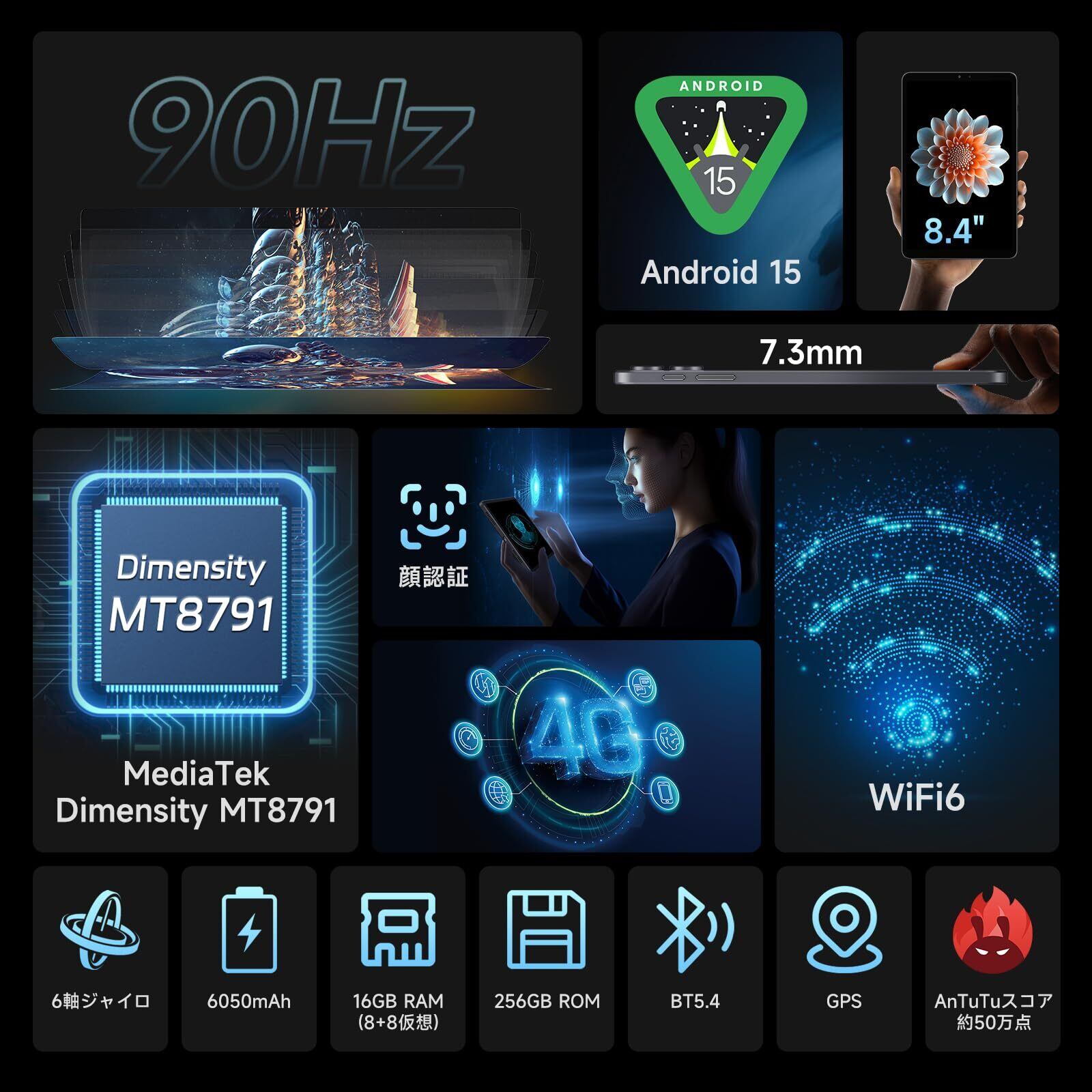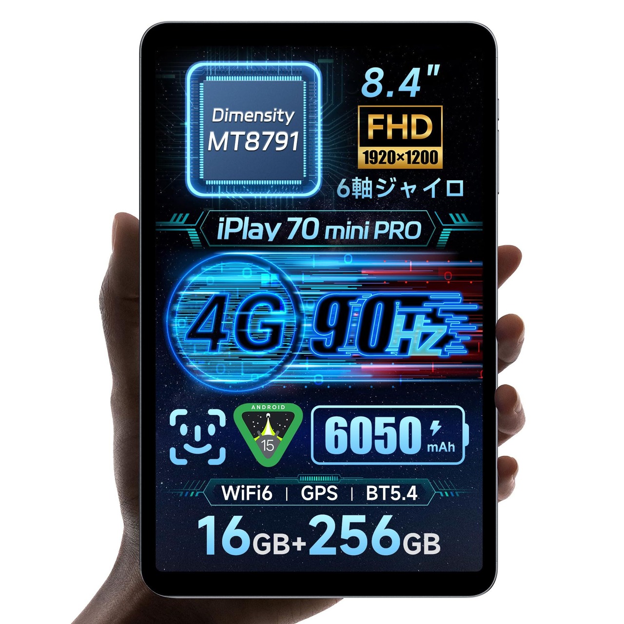 ALLDOCUBE iPlay 70 mini Pro タブレット8.4インチ MediaTek Dimensity MT8791 タブレット Android 15 90Hz高リフレッシュレート 4GLTE 顔認証 1920×1200解像度 16GB+256GB+1TB拡張 6050mAh PD18W 6軸ジャイロ WiFi6 BT5.4 WidevineL1 タブレットアンドロイド