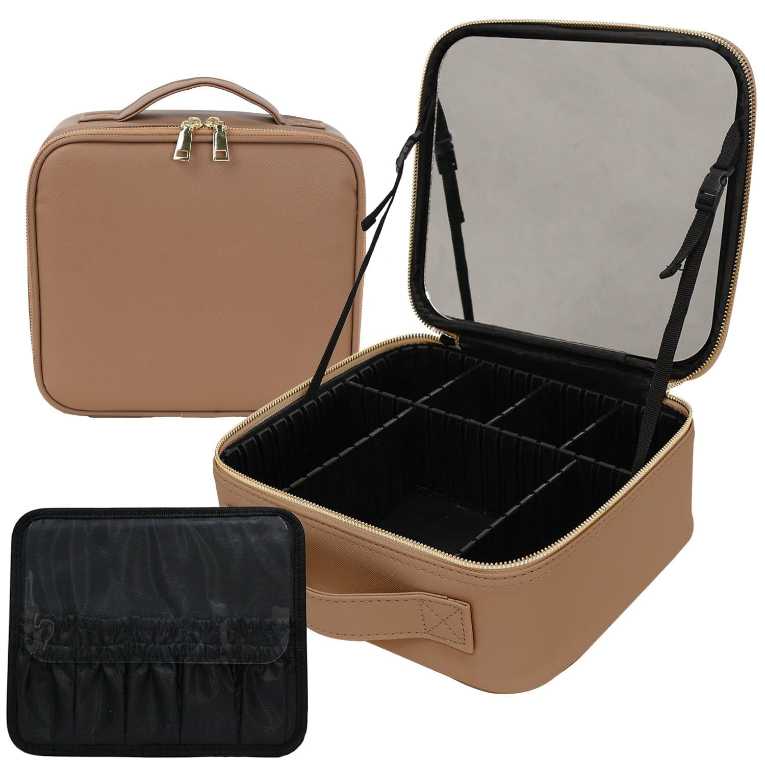 [MRG] 鏡付きメイクボックス オリジナルカラー 大容量 メイクポーチ コスメボックス 持ち運び 鏡付き プロ用 自立式 仕切り調整可能 メイク収納 コンパクト 化粧ポーチ 手持ち コスメ収納 オープン 大きめ 横長 道具 メイクブラシ 化粧品 スキンケア お出かけ 旅行 (モカ:通常タイプ)