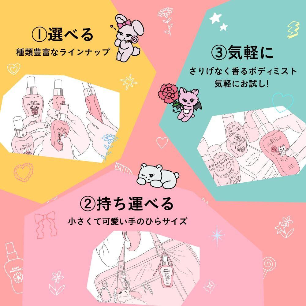 【Point:ポイント】①「選べる」種類豊富なラインナップ ②「持ち運べる」小さくて可愛い手のひらサイズ ③「気軽に」さりげなく香るボディミストを気軽にお試し!