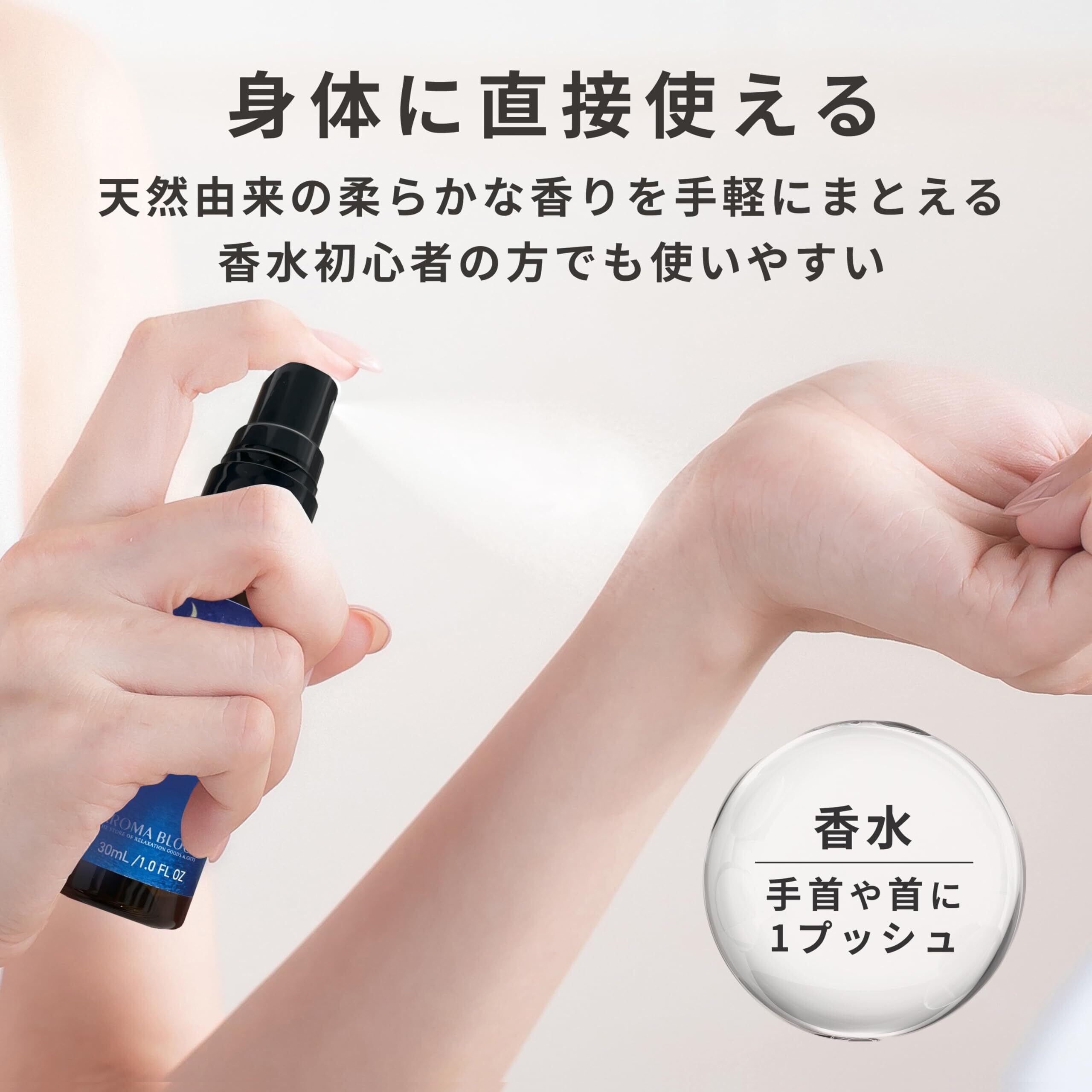 【ご使用方法】ご使用の際にはよく振ってからお使いください。 ○枕やシーツ、カーテン、ファブリック、タオルなどに20~30cm程度離して2~3回プッシュすると柔らかな香りが広がります。 ○首や手首などに1プッシュして香水代わりにお使いいただけます。 ○自分の周りなど、空気中に数回プッシュして芳香浴としてもご利用いただけます。