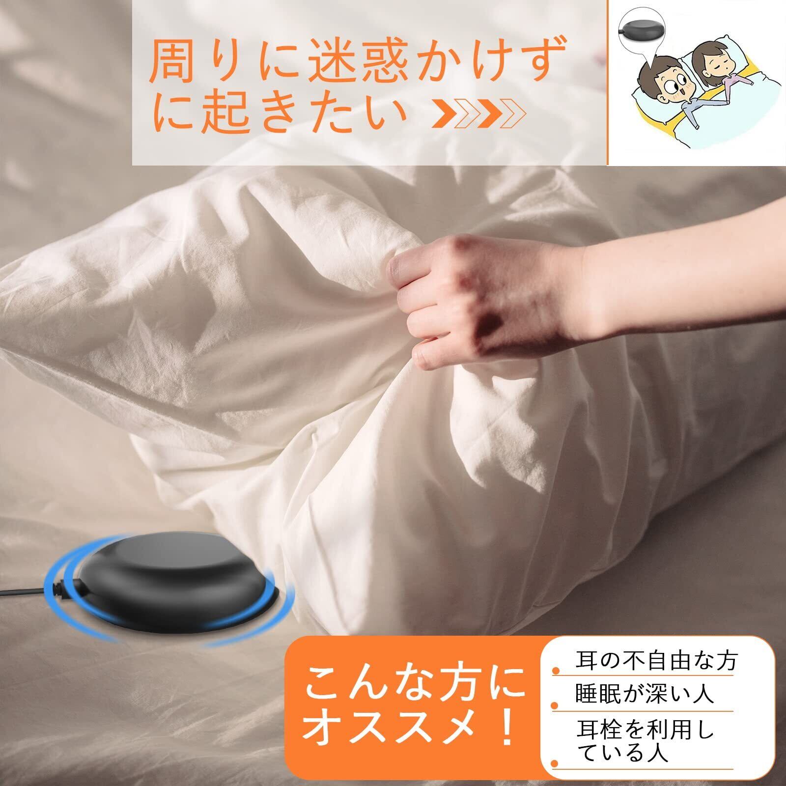 【3つのアラームモード・こんな方におすすめ】振動式目覚まし時計のアラームモードは3つあります。バイブレーションを時計に接続してスイッチを【BUZZ】にする場合、アラーム時間になると、スピーカーが鳴らず、バイブが約一枕の範囲まで振動を伝え、声が出ないので、周りに迷惑かけずに起きれます。 突然大音量が出る伝統的な目覚まし時計より、バイブの振動なら胸がドキドキすることなく起きられ、朝から快適な気持ちで一日を迎えます。 耳栓を利用して寝るため、通常の目覚まし音は聞こえない方なら、ぜひこの振動式めざまし時計を試して下さい。耳の不自由の方にオススメです。