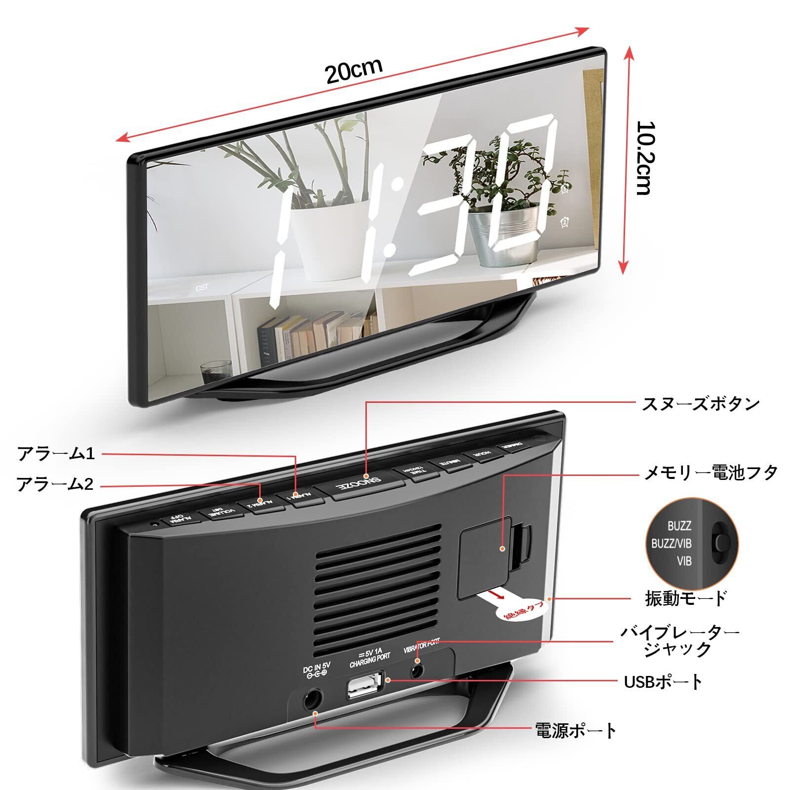 【8.7インチミラーディスプレイ・調光調音】8.7インチのミラー目覚まし時計はクラリティの高いディスプレイが備えており、大きな時間表示で見やすく、置き時計は部屋のインテリアや化粧鏡としても適切です。明るさが7段分け調整でき、省エネと共に目に優しく、睡眠の妨げになりません。デジタルが一番暗い状態になると、見えなくなる可能性があるところはご注意下さい。 大音量の目覚まし時計は 、ボリュームは7段式(90db~110db)、リズムによってアラームの音量が設定できて、朝どうしても眠れたい時は「SNOOZE」ボタンを押し、アラームが一旦止めて、そして9分間ごと動きます。朝が弱い方の寝過ごし対策として大変便利です。