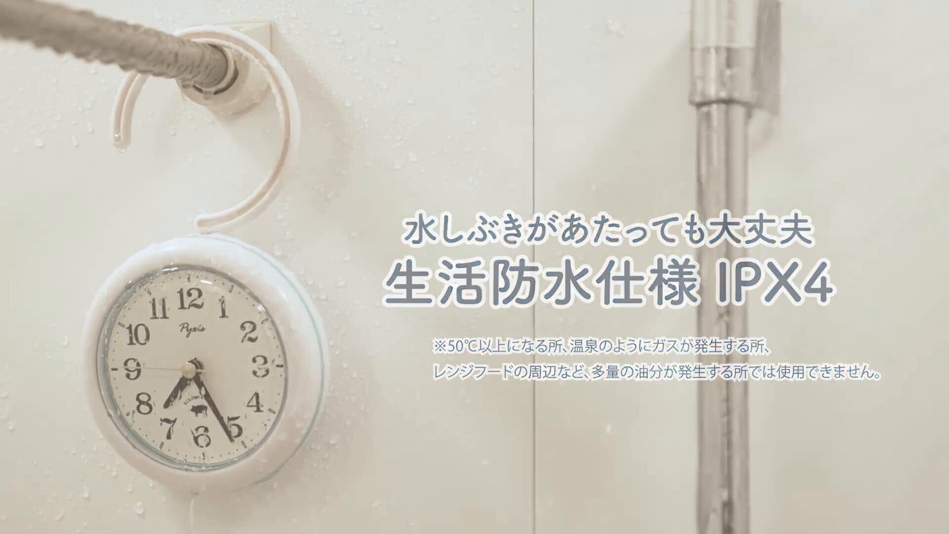 ●大きなフックやスタンドがついているのでいろいろな場所に掛けたり置いたりできる水回りに便利なクオーツ時計です。