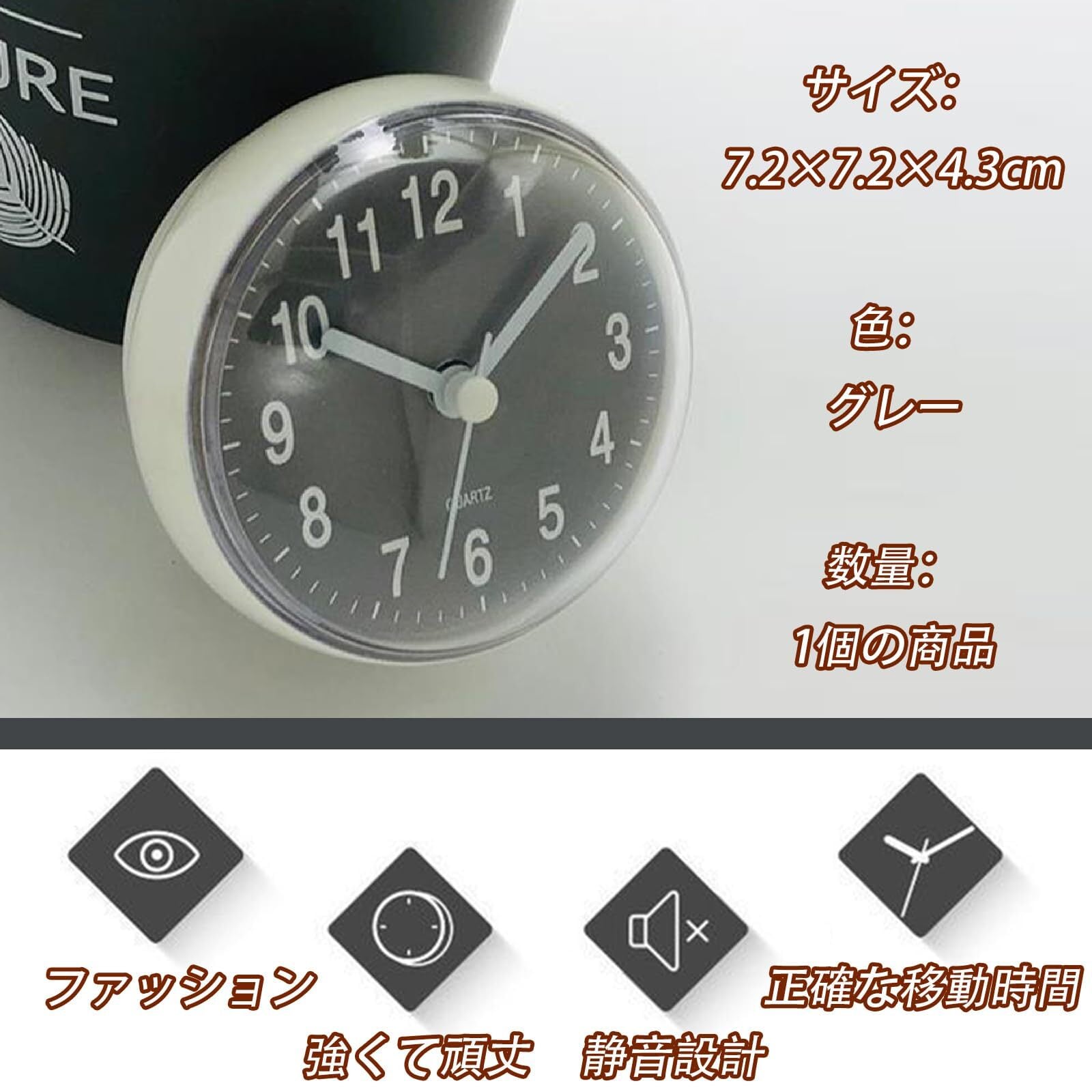 【小型】商品サイズ:7.2×7.2×4.3cm、ミニ吸盤掛け時計 1 個グレー、コンパクトサイズなため、学校や仕事先でのスケジュール管理にも役立ちます。この小さなかわいい時計も環境への装飾として行動することができます