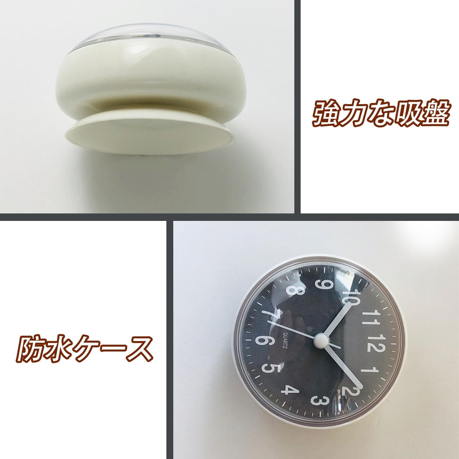 【取付説明】浴室の壁、鏡、ガラス、タイル等の滑らかで乾燥した表面に簡単に固定することができ、使いやすい吸盤付き掛け時計です。しかもデスクトップに置くこともできます。