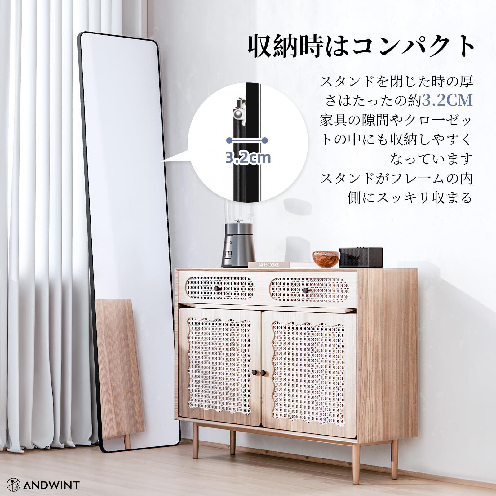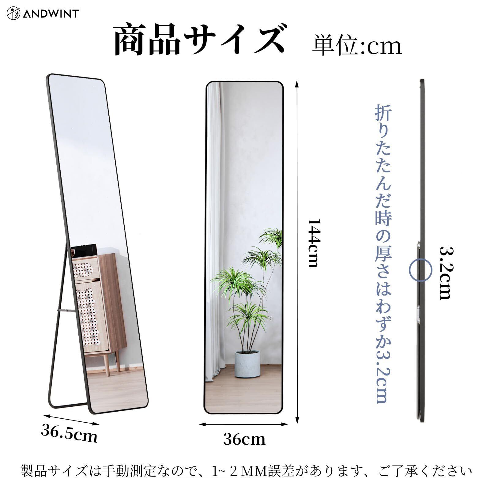 【特価商品】ANDWINT 鏡 ミラー 姿見鏡 全身鏡 立て鏡 幅36.5×高144cm 丸角スタンドミラー 壁掛けスタンディング試着鏡 フルボディミラー ダンスミラー 割れない 立てかけ 地震対策 飛散防止 ブラック