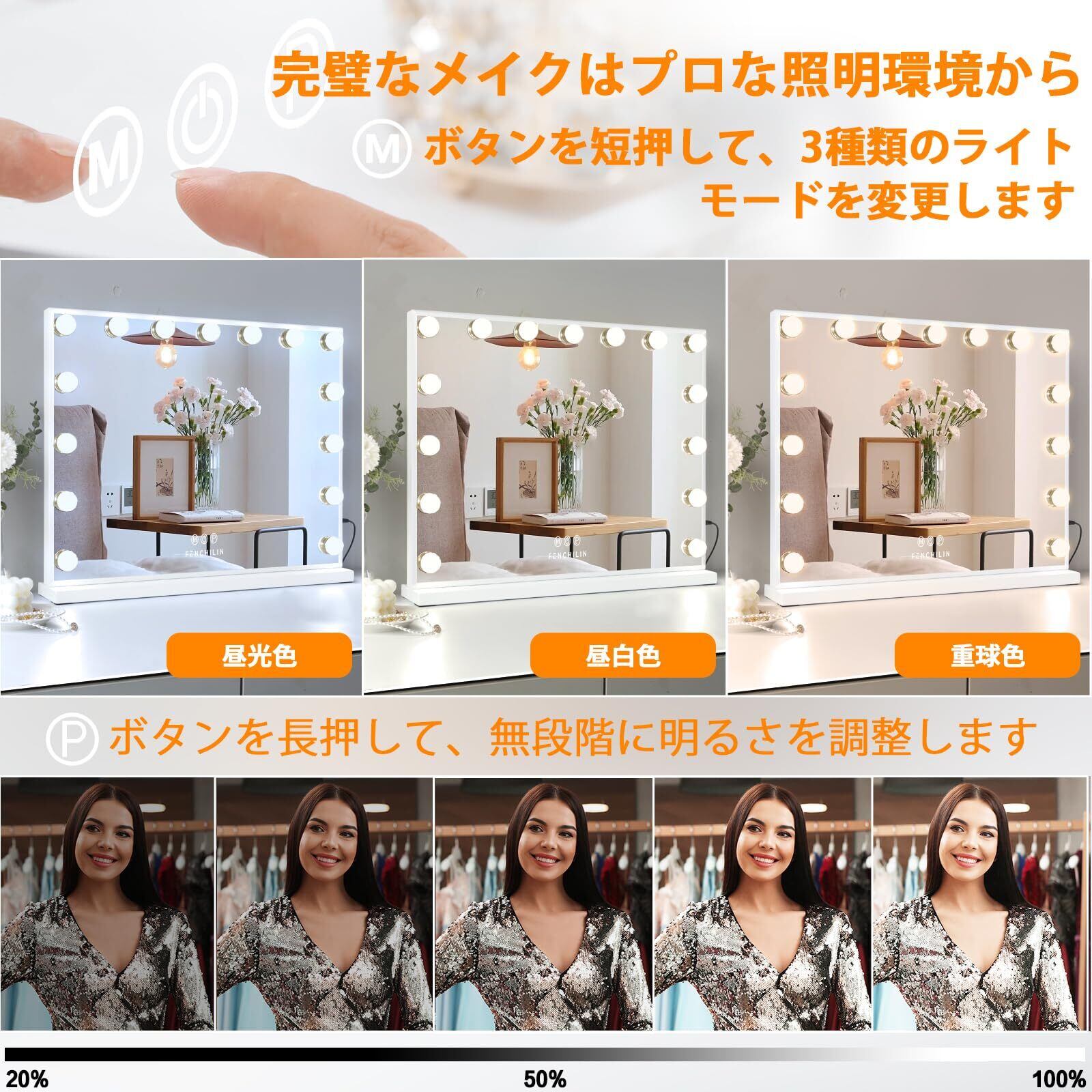 強化ガラス・スマホ充電ポート付き女優ミラー:FENCHILIN 58x45cm 女優鏡は強化ガラスを採用しているため、一般ガラスに比べて衝撃に強く、多少の衝撃や振動でも割れにくいです。万が一破損したとしても、破片が鋭利なものではなく細かい粒状になって割れるから災害時や事故の時にケガをしにくいです。ミラーの側面にUSB充電ポートを搭載されるため、メイクしながら、スマホ充電することもできます。ご注意:このモデルにはBluetooth機能は付属していません。