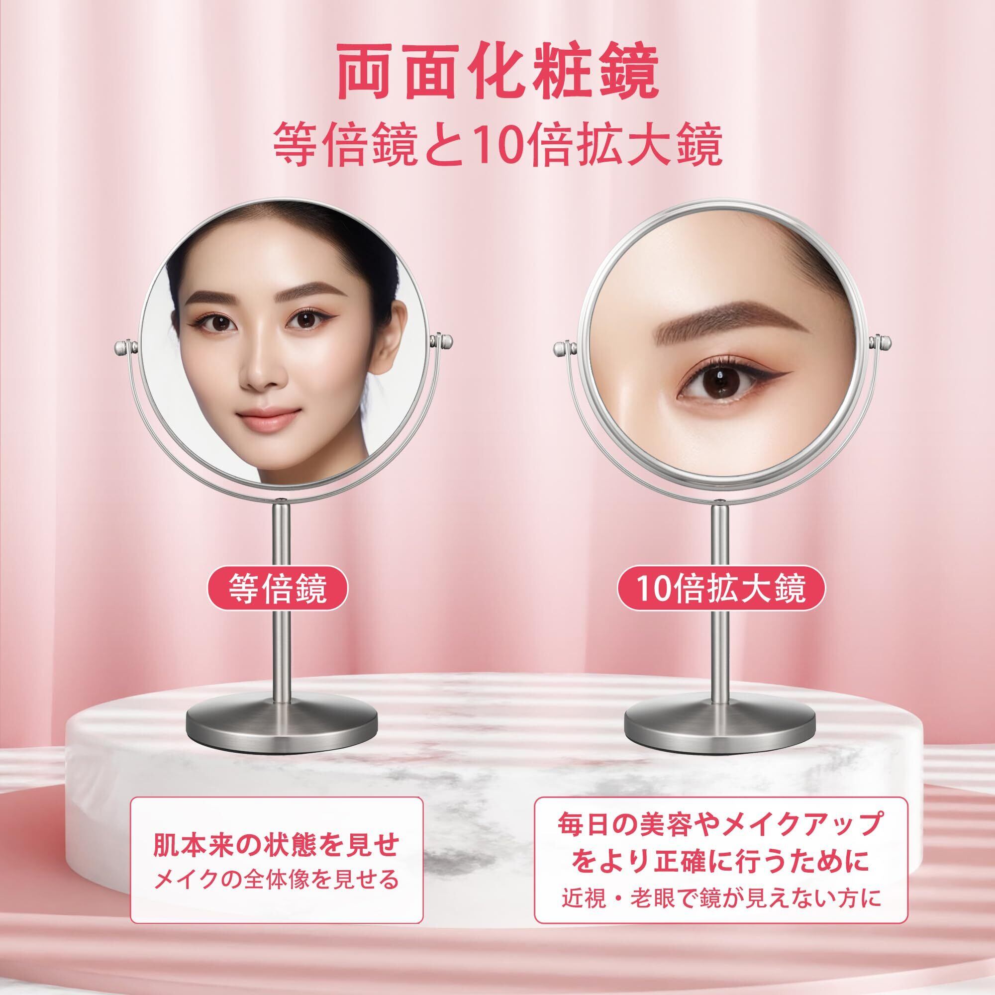 【等倍鏡&10倍拡大鏡】1つのスタンドミラーで2つのニーズをクリアし、必要に応じて鏡面を切り替えて、日常のスキンケアやメイクを完成させることができます。片面は普通の等倍鏡で、全体の顔効果をリアルに反応させることができます。もう一方の面は10倍鏡で、顔の特徴を拡大し、コンタクトレンズを使ったり、アイラインを引いたり、眉を整えたりするなど、精密な美容ケアを助けることができます。近視や老眼の人にも便利に使えます。注意:画面の歪みを防ぐためには、10倍拡大鏡を使用する場合、距離は12~15センチが最適です。