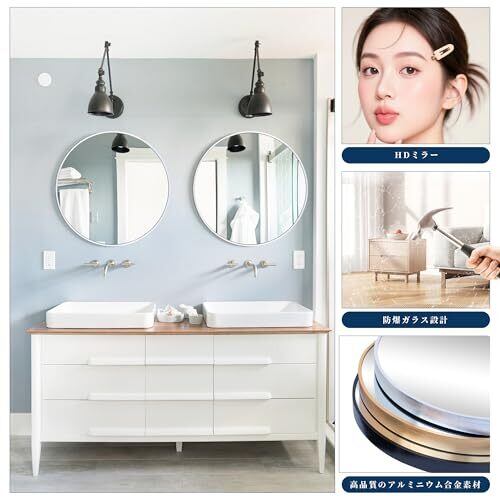 【おしゃれなフレームデザイン】丸い鏡の裏は鉛と銅を含まないアルミフレーム素材を使用し、バスルームのような湿度の高い環境でも使用できます。フレームの設計は十分に堅牢であり、ミラーが破損したり損傷を受けたりすることを防ぎ、偶発的な衝突時には緩衝材として機能します。バスルーム、玄関、ドレッサー、リビングルームなど、様々な場所で使用できます。