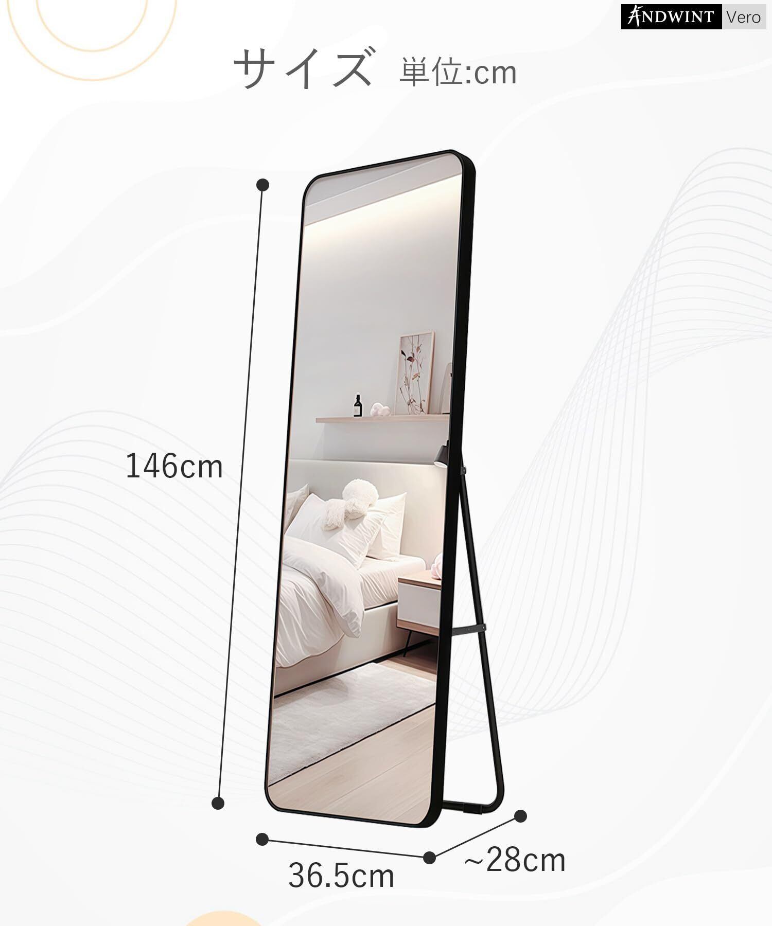 ANDWINT Vero 姿見鏡 全身鏡 幅36×高さ143cm 大型 スタンド鏡 持ち運び便利 飛散防止 壁掛けミラー 壁掛け鏡 スタイルチェック ブラック