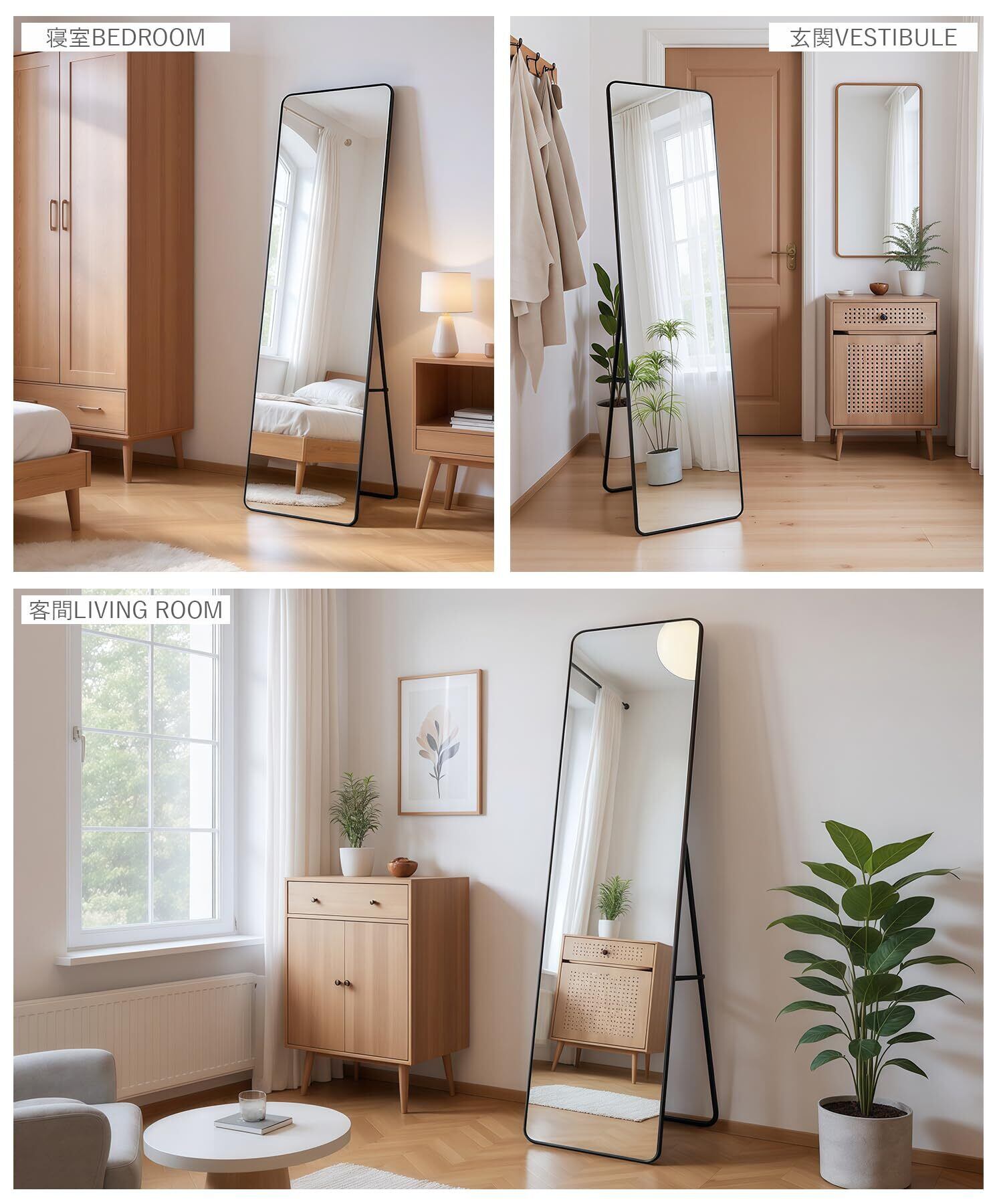 【様々なシーンに対応できる全身鏡】客間、玄関、廊下、脱衣所など、さまざまな場所に設置可能な姿見鏡です。リビングや寝室などにインテリアとして置きたい人にもマッチです。身だしなみをチェックできる大きな全身鏡です。頭から足先まで映せるのができ、第三者視点で服装をチェックできるため、全身のコーディネートのバランスを整えたいときにも役立ちます。