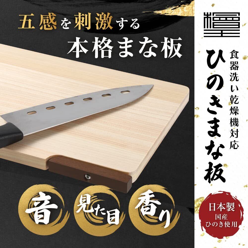 【特長】 ・食器洗い乾燥機対応のひのきまな板です。 ・回して立てる便利なスタンド付きで、収納場所に困りません。 ・水がしみ込みやすく、黒ズミやすい側面にウレタン樹脂塗装を施しておりますので、水の侵入を抑え、乾きが早くなり黒ズミを抑えます。 ・反りを抑える「反り防止加工」を施しています。