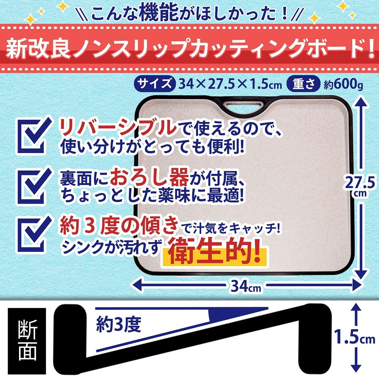 【商品基本仕様】主婦50人の「あったら良いな」という意見を反映し、1.滑らず 2.両面使えて 3.衛生的 な商品を開発致しました。生ものを切るときは表側・それ以外を切るときは裏側と分けて使えるから食中毒予防にもオススメです。形状が斜めになっているため、余計な水分が流れるので便利です。また、洗った後の水の切れは衛生的である証で、水洗い後ふきんで軽く拭くだけで水が切れてるためお手入れがとても簡単です。