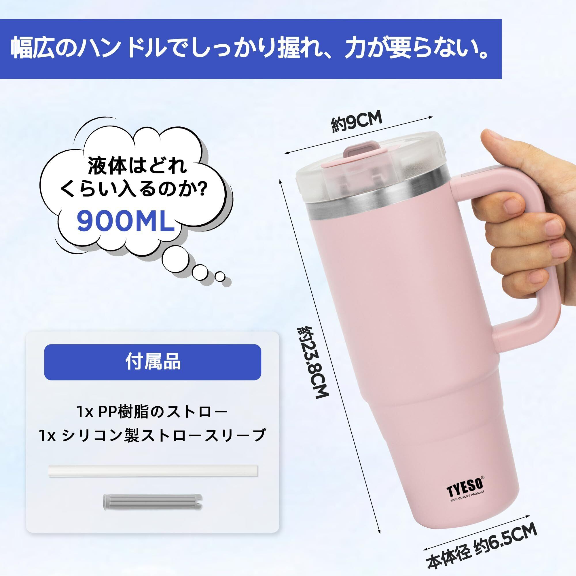 TYESO タンブラー 0.9L 水筒 保冷 ステンレスボトル ウォーターボトル ストロー 取っ手付き ジョッキ アウトドア 真空断熱 二重構造 広口 大容量 直飲 女の子 男の子 900ml 桜色