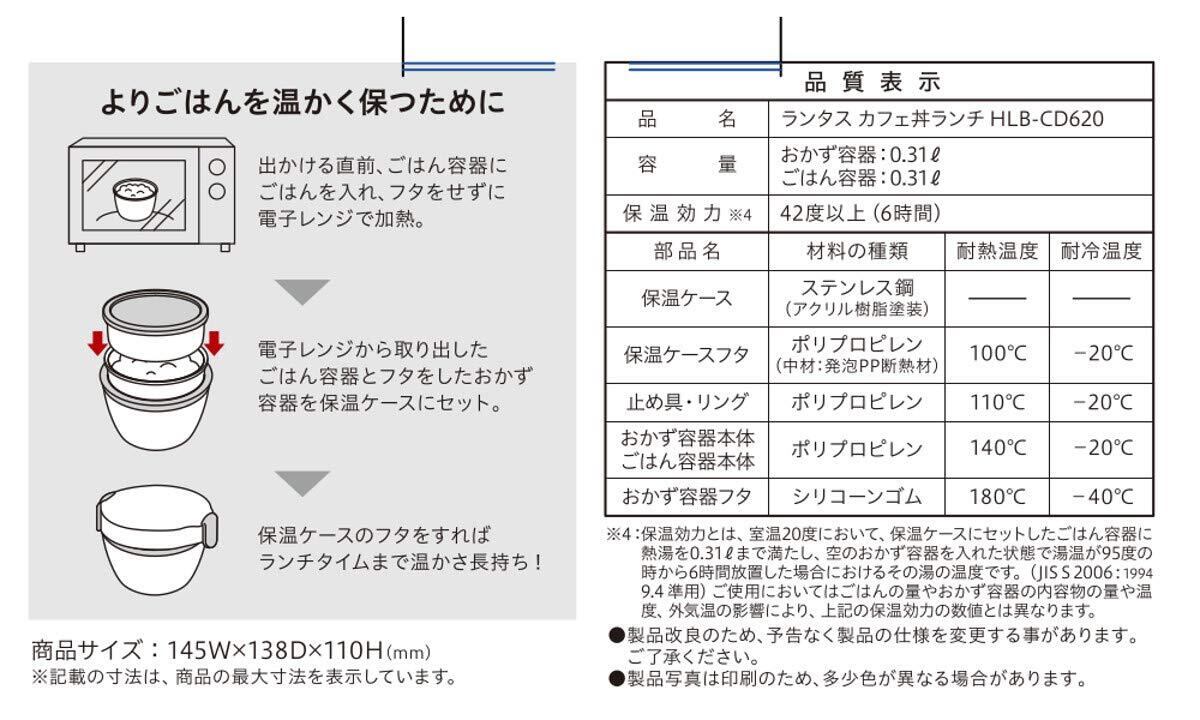 材質:保温ケース/ステンレス鋼(アクリル樹脂塗装)、保湿ケースフタ/PP(中材:発泡PP断熱材)、止め具・リング・おかず容器本体・ご飯容器本体/PP、おかず容器フタ/シリコーンゴム