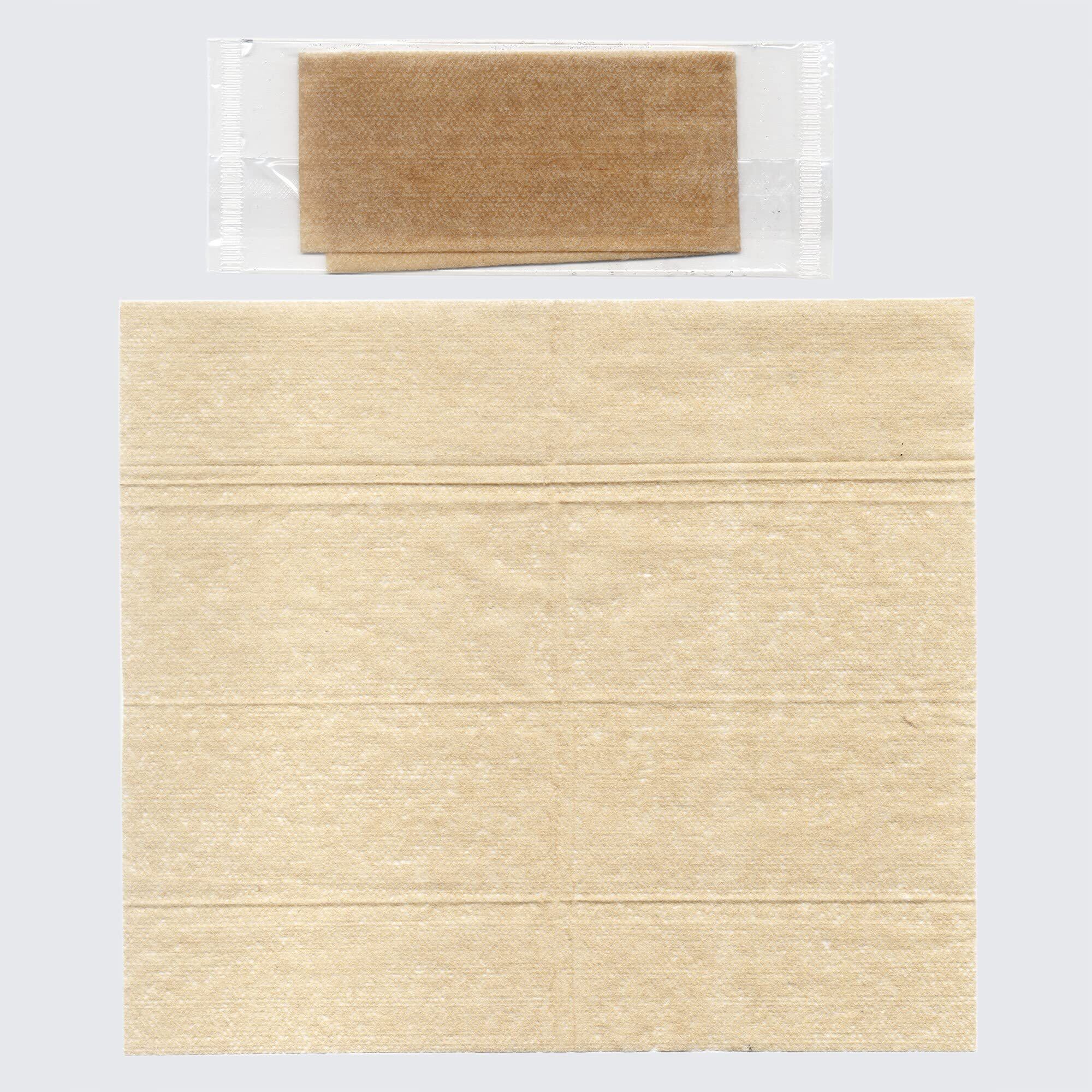 未晒しの自然なブラウンがオシャレな使い捨ての平型おしぼり。ウェットタイプなので、お食事前のお手拭きにもピッタリです。肌に直接触れるものだから、日本国内製造で安心してお使いいただけます。