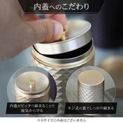 【湿気や光をシャットアウト】 お茶の美味しさを守るため、外蓋はネジ式でしっかりと閉まり、通常サイズにはさらに内蓋付き。ぴったり密閉されることで湿気を寄せ付けず、茶葉本来の香りと風味を長く保ちます。光や空気による劣化を防ぐアルミ合金素材だからこそ、最後の一杯まで新鮮な状態でお楽しみいただけます。