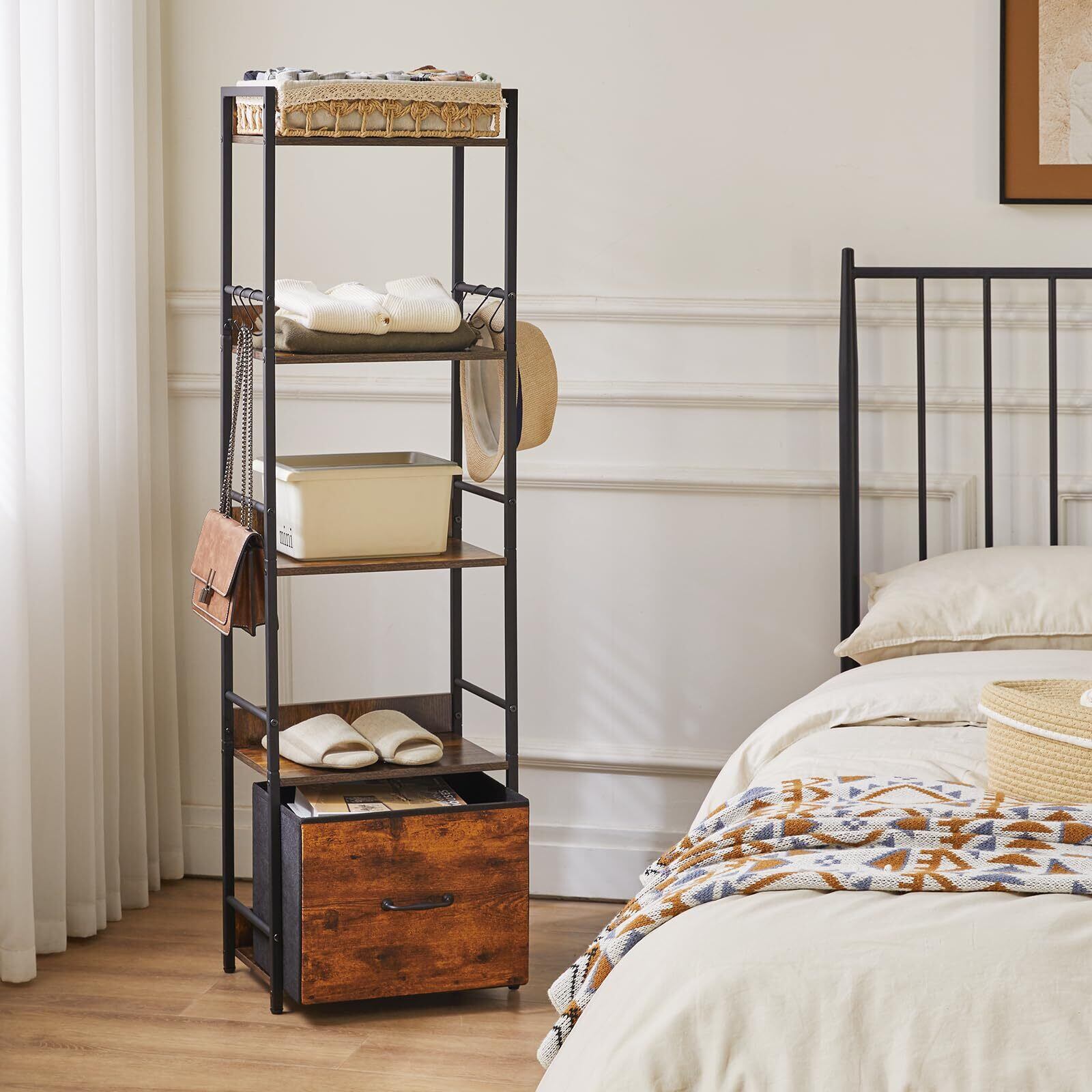 使いやすい:この棚ラックは取り付けやすく、分解も容易で、軽量で、移動や引っ越しに便利です。布の引き出しが1つ付いていて、物を分類して収納しやすく、部屋を清潔に保つことができます。また、6つのフックが付属しており、かばん、イヤホン、鍵、皮むき器と栓抜きなどの小物を収納できます