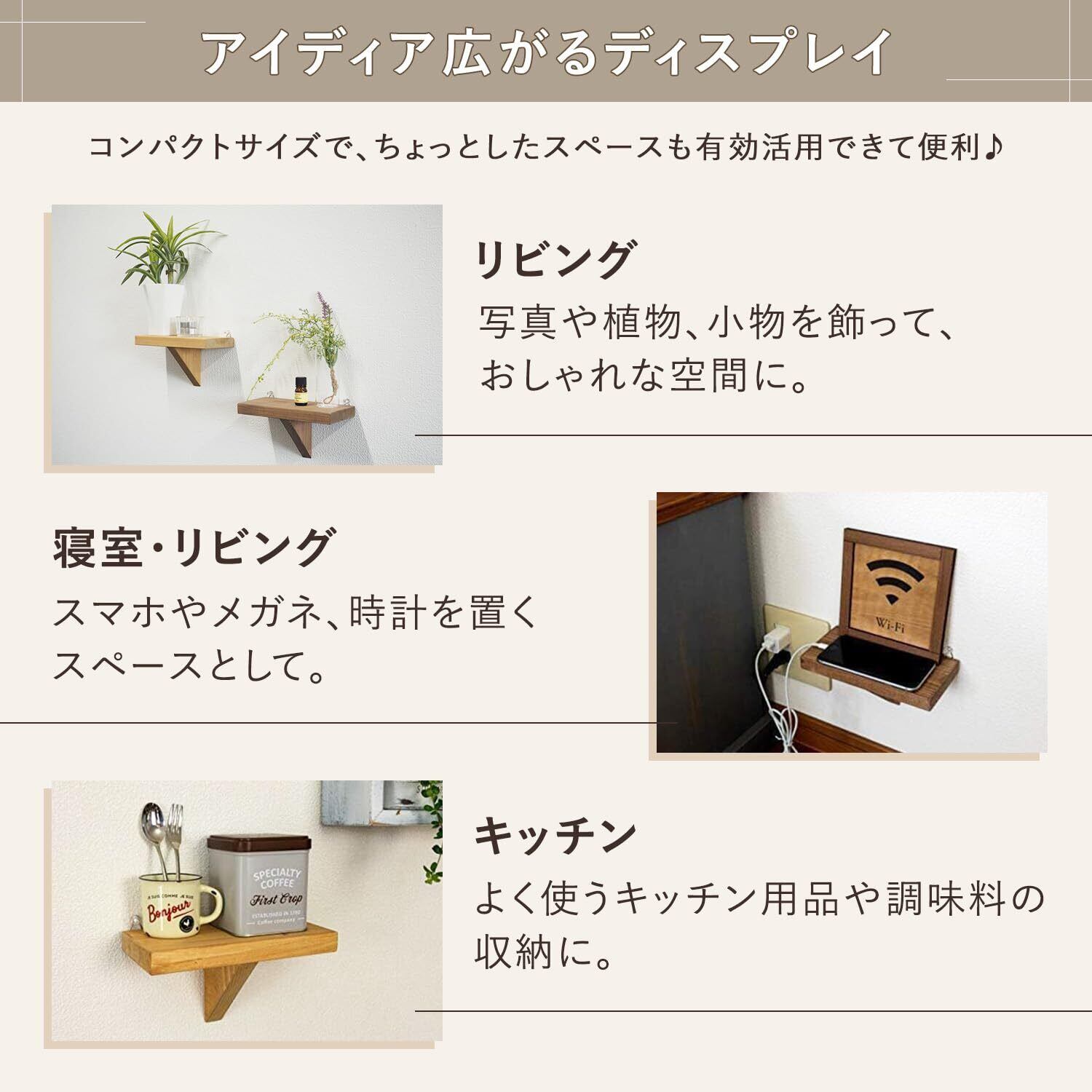このウォールシェルフは、直感的に使用できるシンプルなデザインが特徴です。飾りたいアイテムを手軽に取り出せ、生活空間の利便性を高めます。特にお部屋をおしゃれに演出したい方にぴったりです。