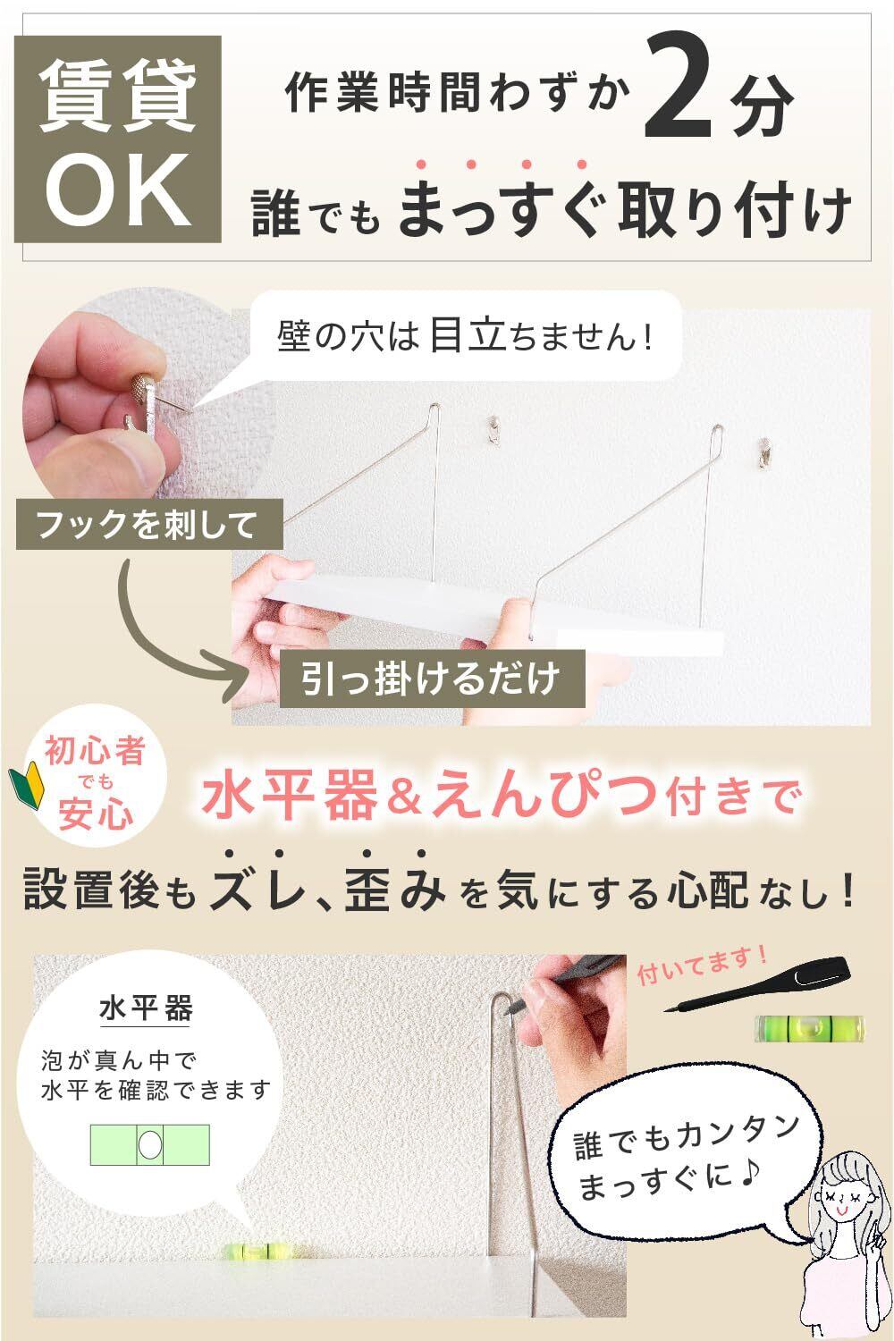 【取り付け方法】 設置は驚くほど簡単。付属の金属製の押しピンフックを刺すだけで、あっという間に壁面収納選が完成します。しっかりとした厚さ1.5cmの丈夫な選板は、安定感抜群です。DIY初心者の方など取り付けに自信がない方でもカンタンに取り付けできるように、水平器・釘まで工具をセットにしました。お客様は何も用意する必要はありません。買いたその日にすぐに取り付けできます。さらに、誰でも取り付けられるように設計された「大工さん監修の詳しい取り付け説明書」が付属しているので心配ありません。
