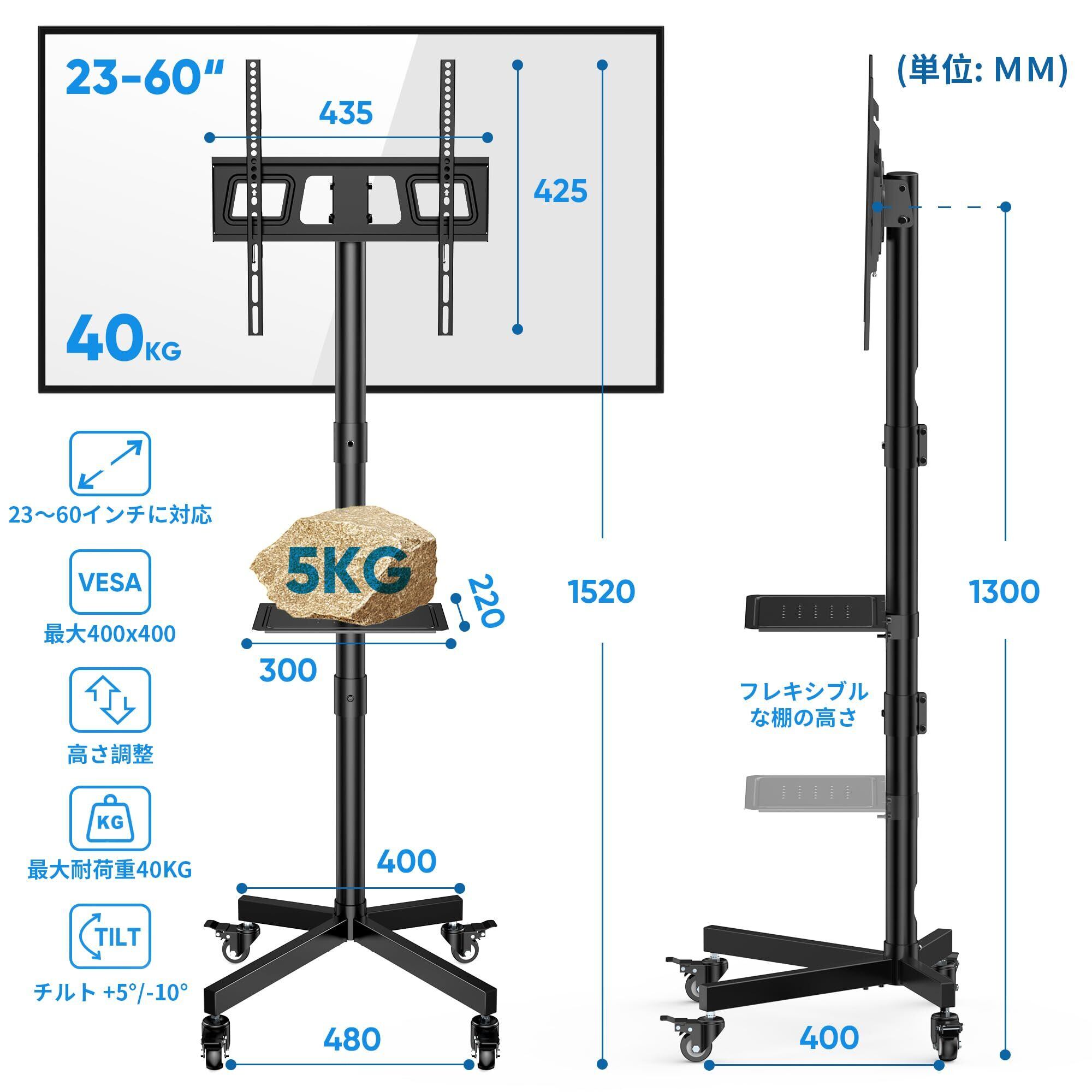 【ユニバーサルテレビスタンド】移動式壁寄せテレビスタンドは重量40kgまでのほとんどの23-60型のテレビに対応します。VESA規格(VESAはテレビ背面にある取付ネジ穴間の間隔)の最大限は400mmx400mmですが、100x100/200x100/200x200/300x200/400x200/300x300/400x300/400x400なども対応できます。ご購入前に必ずテレビのVESA、重量、サイズ仕様をご確認ください。
