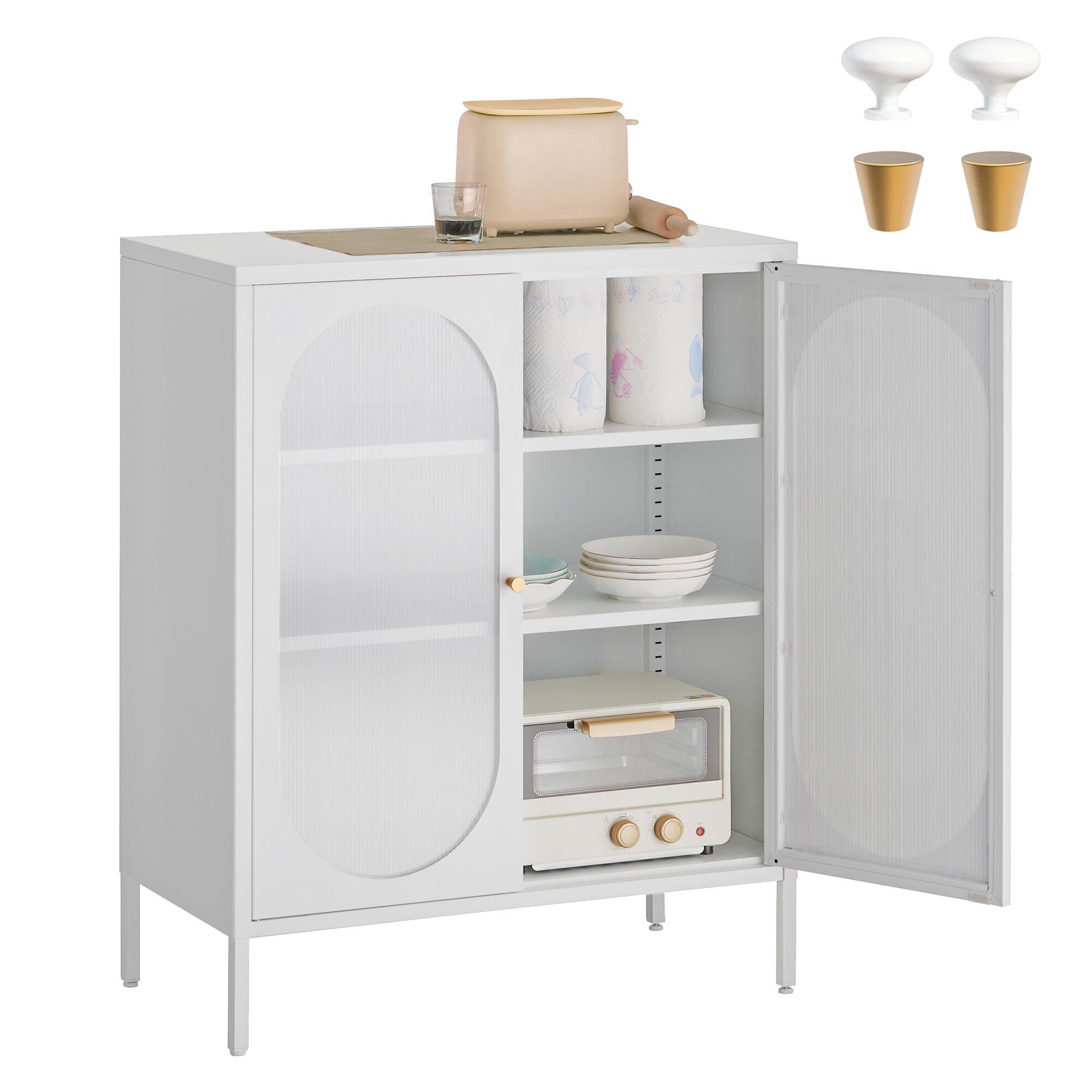 LAND·VOI スチールキャビネット 3段 扉付き収納棚 半透明PCドア 可動棚 キッチン リビング収納 キャビネット おしゃれ お酒棚 食器棚 幅80×奥行40×高さ101cm 組み立て必要 ホワイト