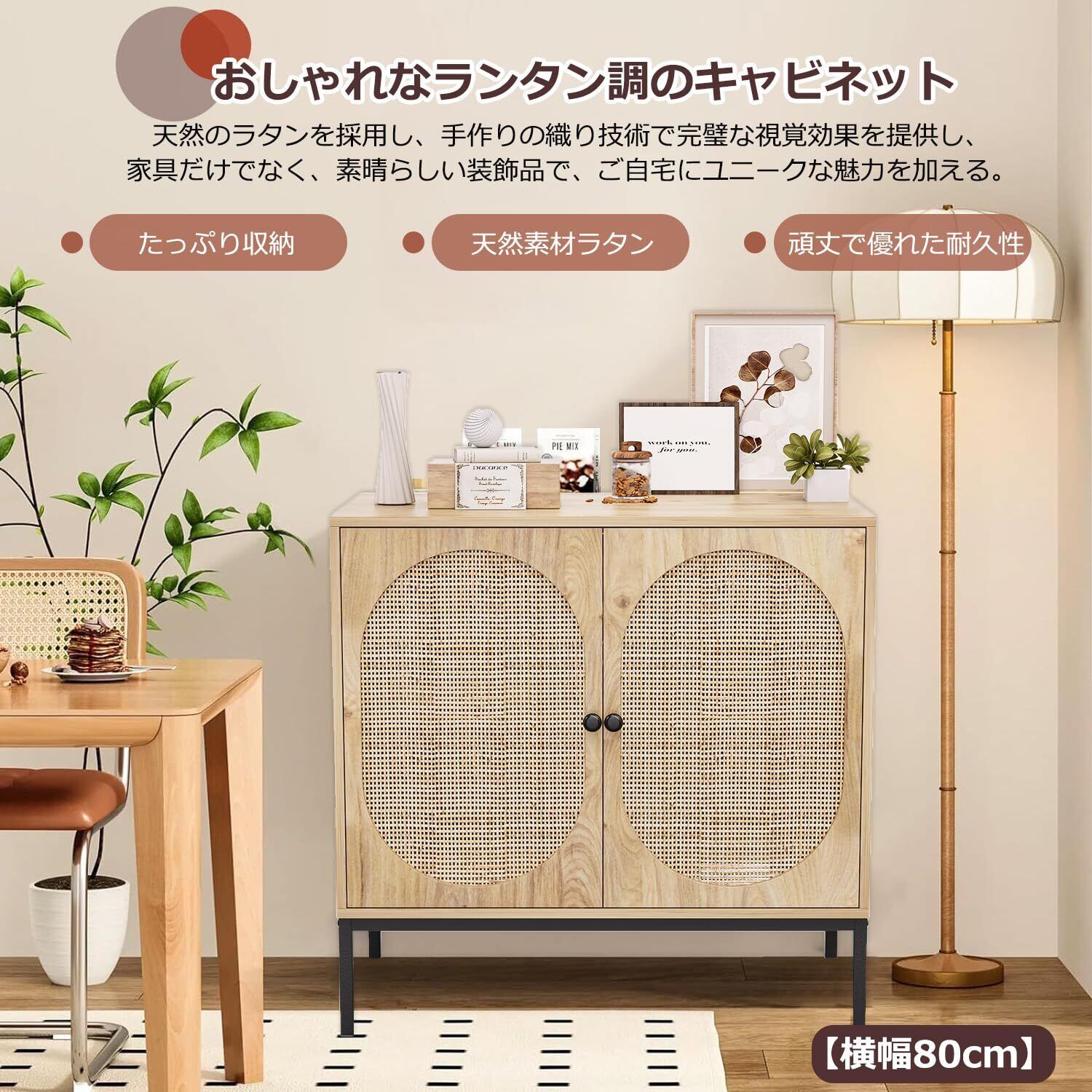 【人気商品】IKIFLY キャビネット 木製 サイドボード ラタンンキャビネット 収納 2扉 チェスト リビングボード ラタン収納棚 アクセント キッチン 収納 コンソール テーブル 調節可能な棚付き おしゃれ いっぱい 収納リビングルーム ダイニングルーム 寝室用 (ナチュラル, 幅80CM)