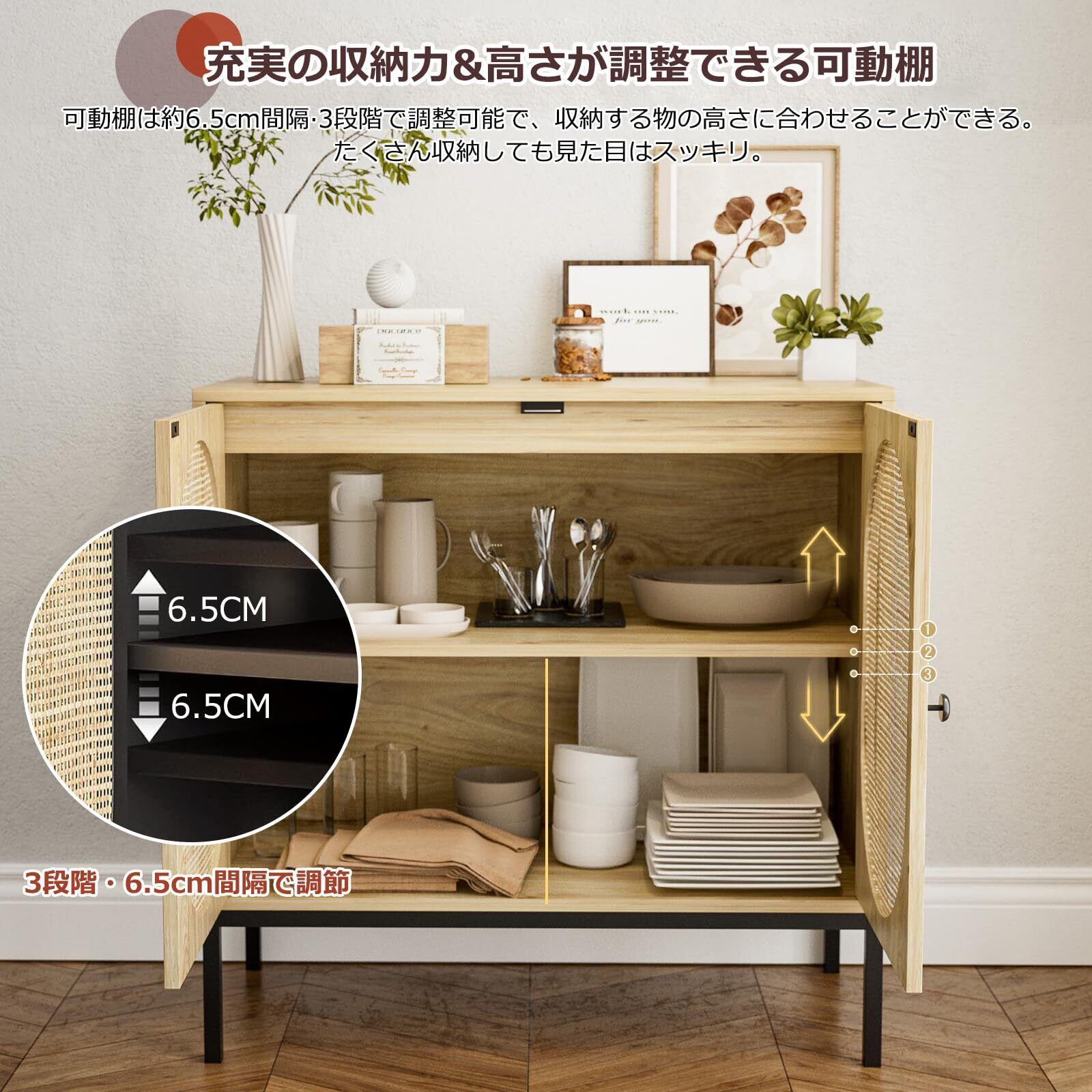 IKIFLY キャビネット 木製 サイドボード ラタンンキャビネット 収納 2扉 チェスト リビングボード ラタン収納棚 アクセント キッチン 収納 コンソール テーブル 調節可能な棚付き おしゃれ いっぱい 収納リビングルーム ダイニングルーム 寝室用 (ナチュラル, 幅80CM)