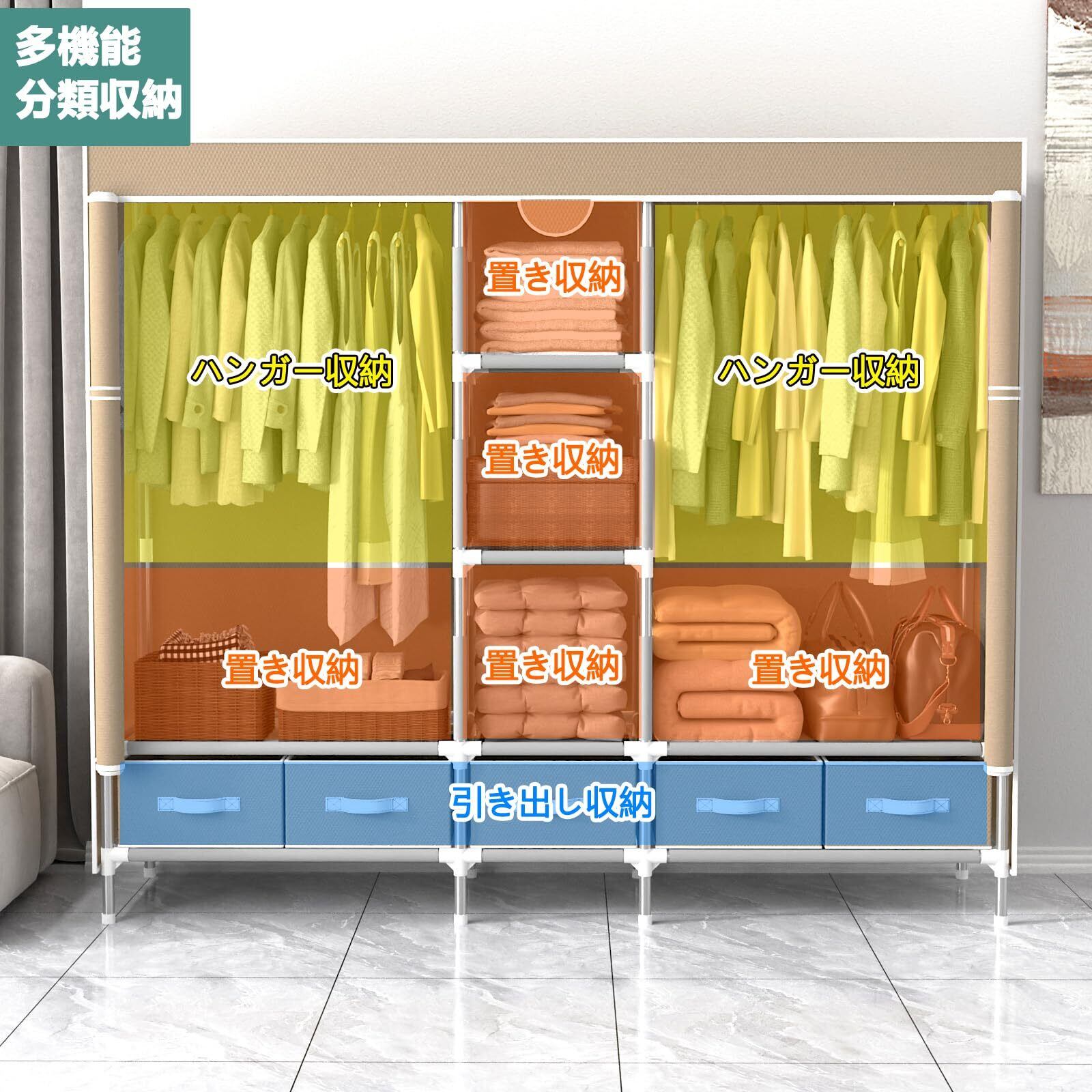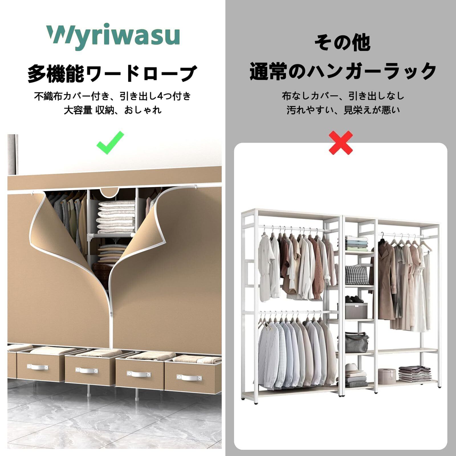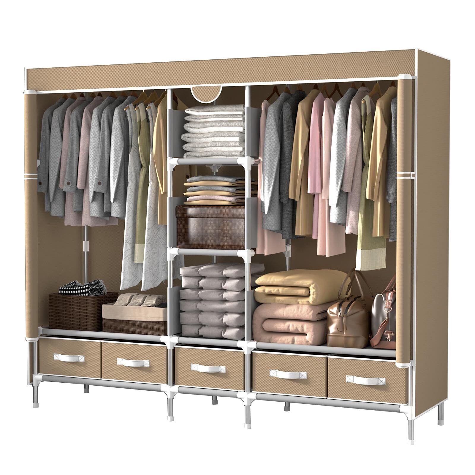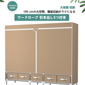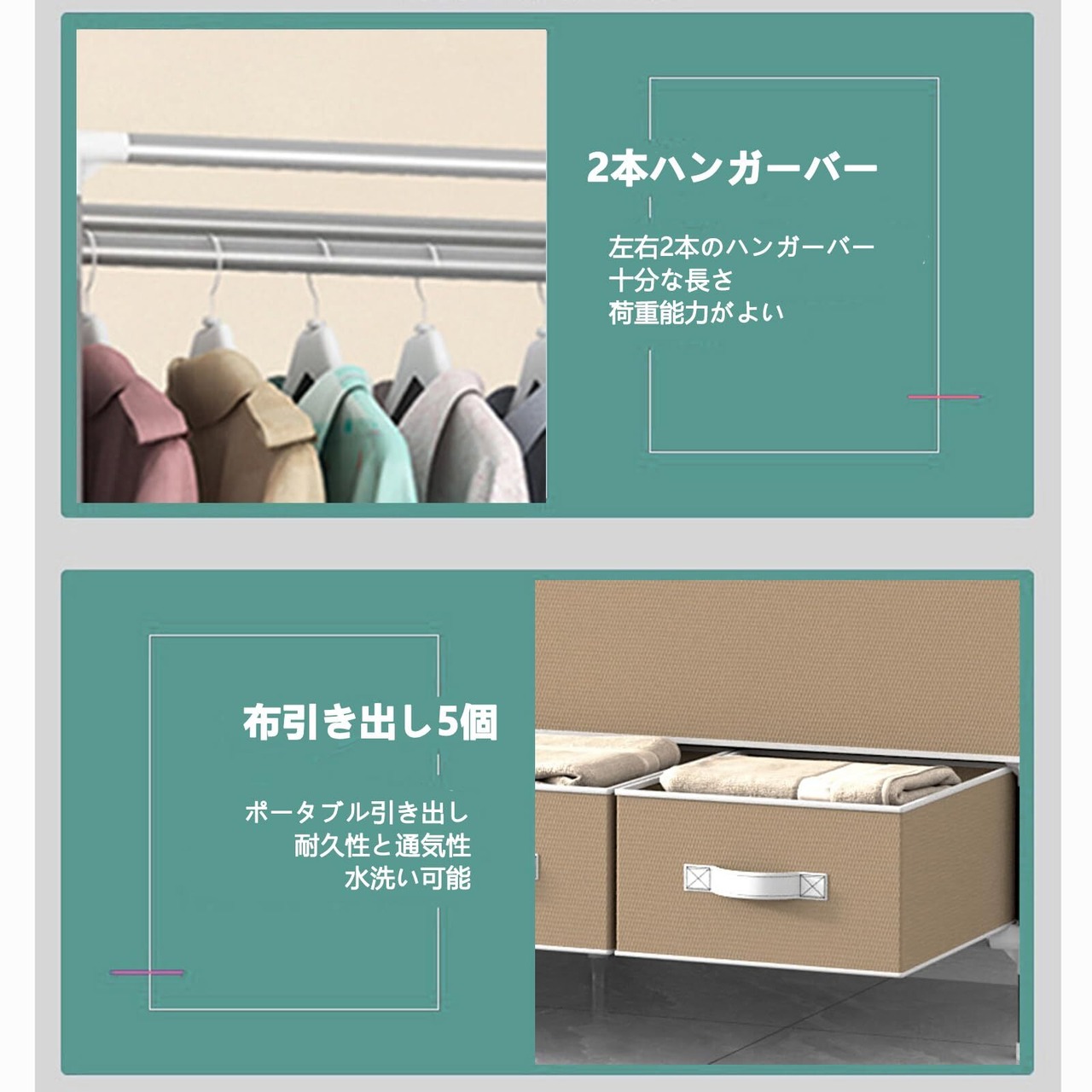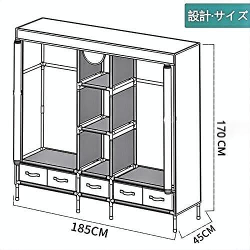 ワードローブ 引き出し5つ付き 大容量 収納 クローゼット おしゃれ 不織布 簡単組立式 ハンガーラック 収納棚 防水 防塵 防汚(185×奥行45×高さ170cm) (ライトブラウン)