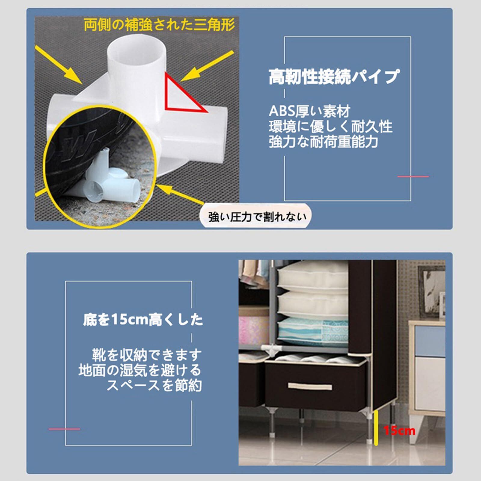 【大容量クローゼット】:大容量サイズ:150cm×45cm×170cm。 ポータブルワードローブは、リーズナブルな4コンパートメントレイアウトデザインです。 上層に洋服を掛けたり、中層に寝具を置いたり、両側に中小物を置いたり、下の引き出しに靴下や下着などの日用品を別々に収納したりできます(また、吊り下げ収納 ポケットが付属しています、これはあなたに余分な収納スペースを提供します)。